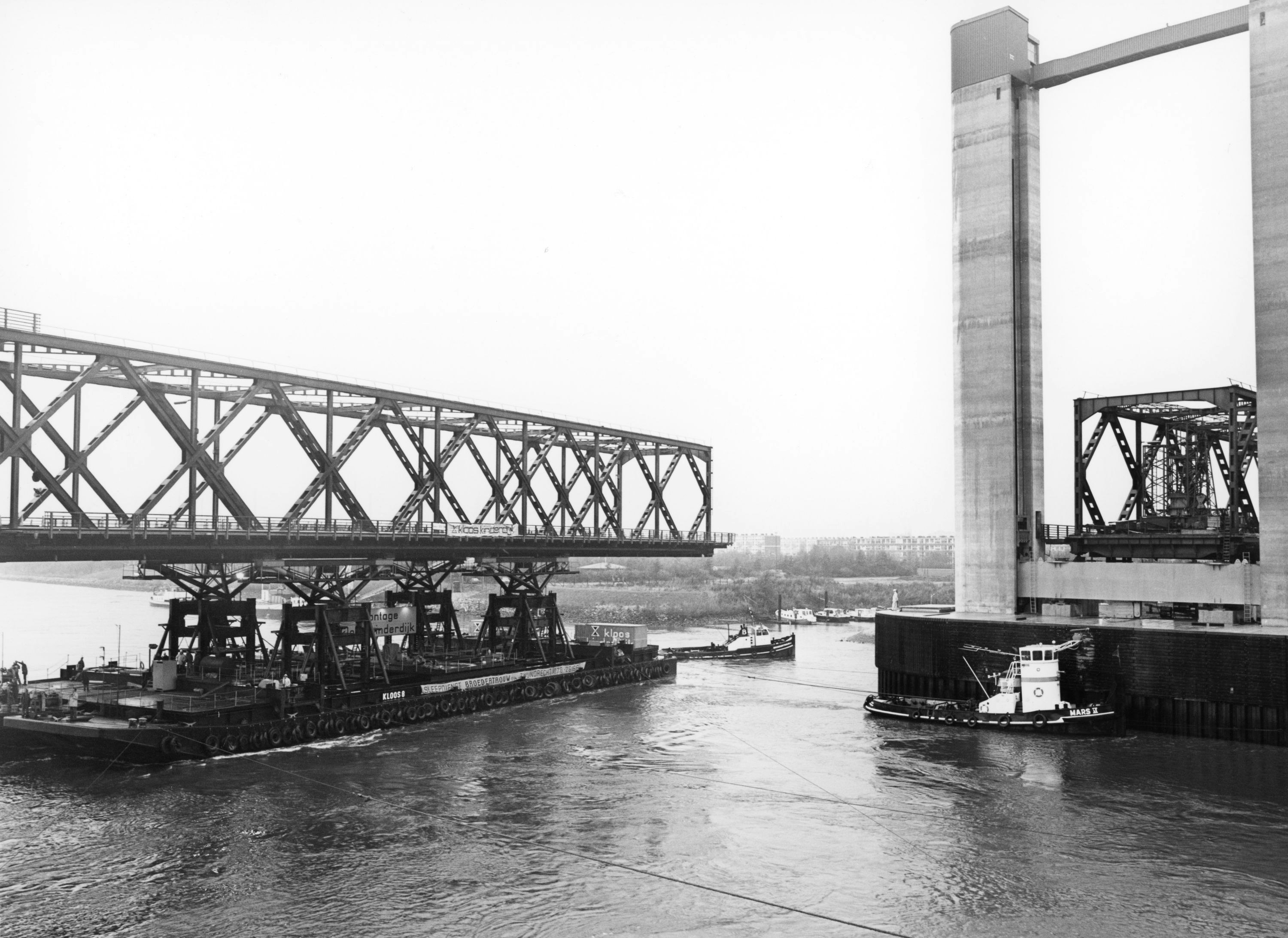Eenmaal aangekomen op locatie werden de brugdelen naar de brug gevaren en op hun plek gebracht. Een precisiewerk, weet Bosch nog goed. ‘Dat invaren gebeurde bij hoogwater. Vervolgens werd het langzaam weer eb, waardoor de brugdelen op hun plek zakten. Daarna konden de sleepboten de pontons eronder vandaan trekken.’