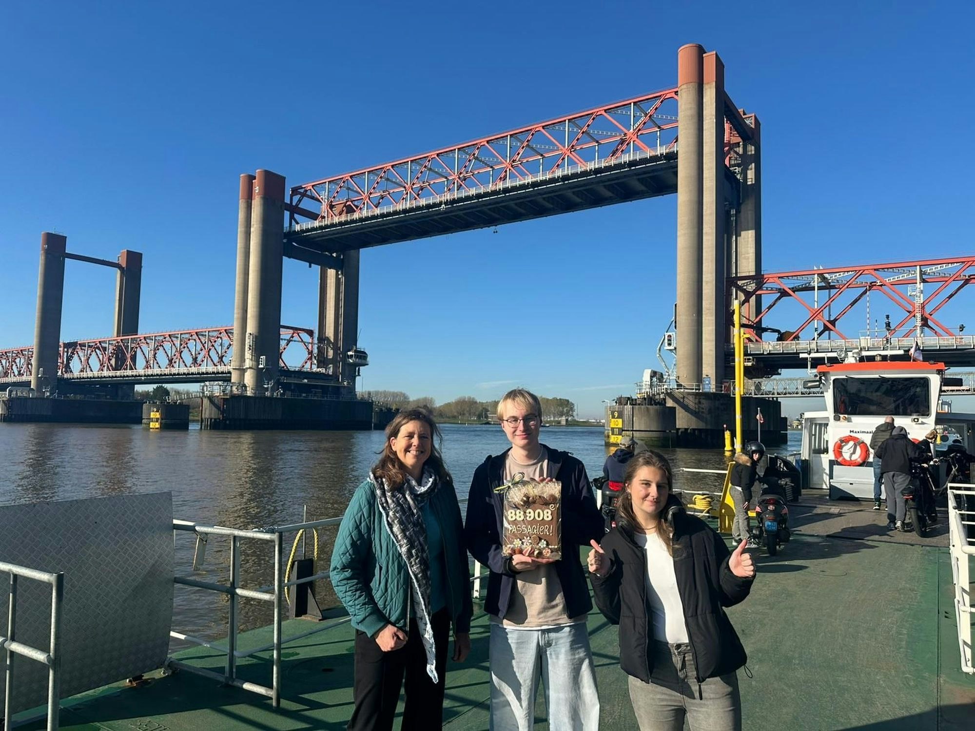 Om dit bijzondere moment te vieren werd passagier nummer 88.908 in het zonnetje gezet. De zestienjarige Roan uit Hoogvliet was de gelukkige deze ochtend: hij kreeg van Marianne Jongen, omgevingsmanager bij Rijkswaterstaat, een chocolade ‘trofee’ uitgereikt van een bekende chocolaterie uit Spijkenisse.