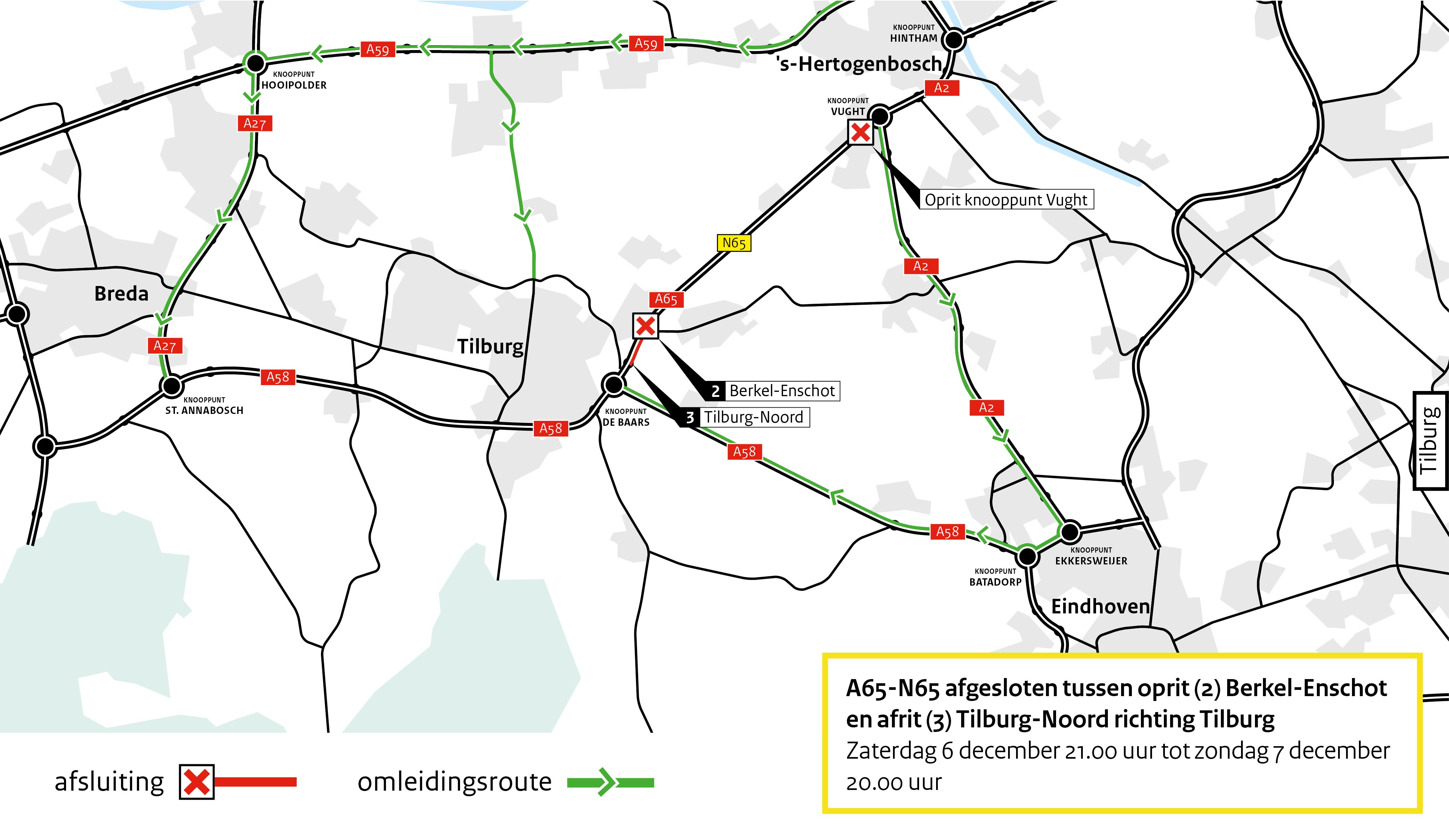 De A65 tussen oprit Berkel-Enschot (2) en afrit Tilburg-Noord (3) richting Tilburg is afgesloten van zaterdag 6 december 21.00 tot zondag 7 december 20.00 uur.