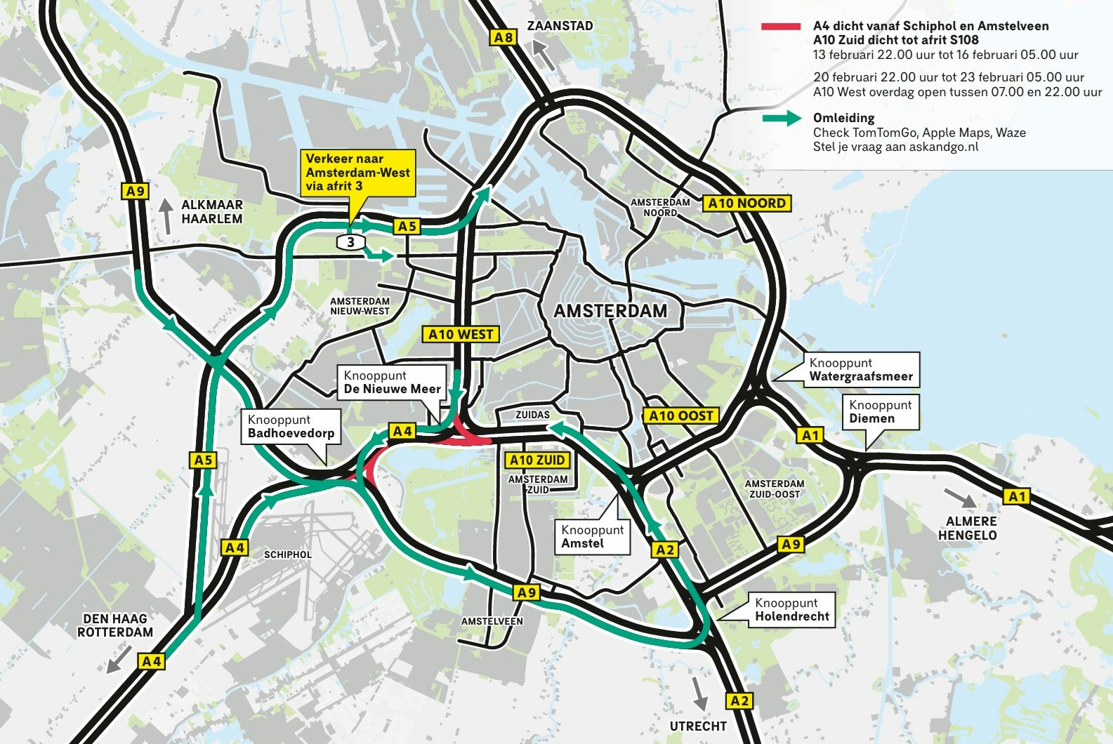 In het weekend van 20 tot 23 februari 2026 is de A4 dicht vanaf knooppunt Badhoevedorp vanuit de richtingen Schiphol en Amstelveen. Ook is de A10 Zuid afgesloten vanaf knooppunt De Nieuw Meer tot aan de afrit S108, richting de A1 (Hengelo) en de A2 (Utrecht).