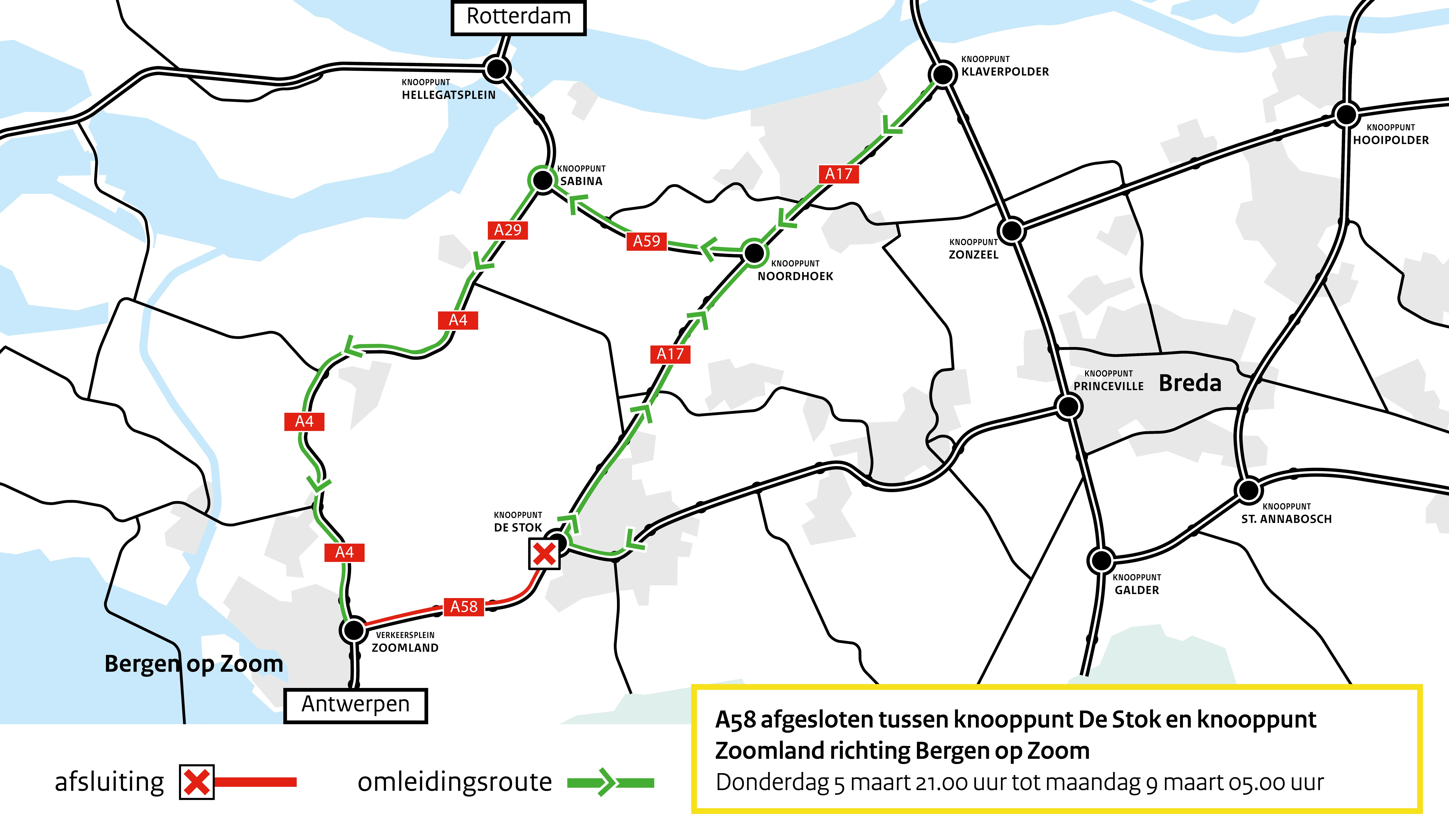 De A58 tussen knooppunt De Stok en knooppunt Zoomland richting Bergen op Zoom, van donderdag 5 maart 21.00 tot maandag 9 maart 05.00 uur, is afgesloten: