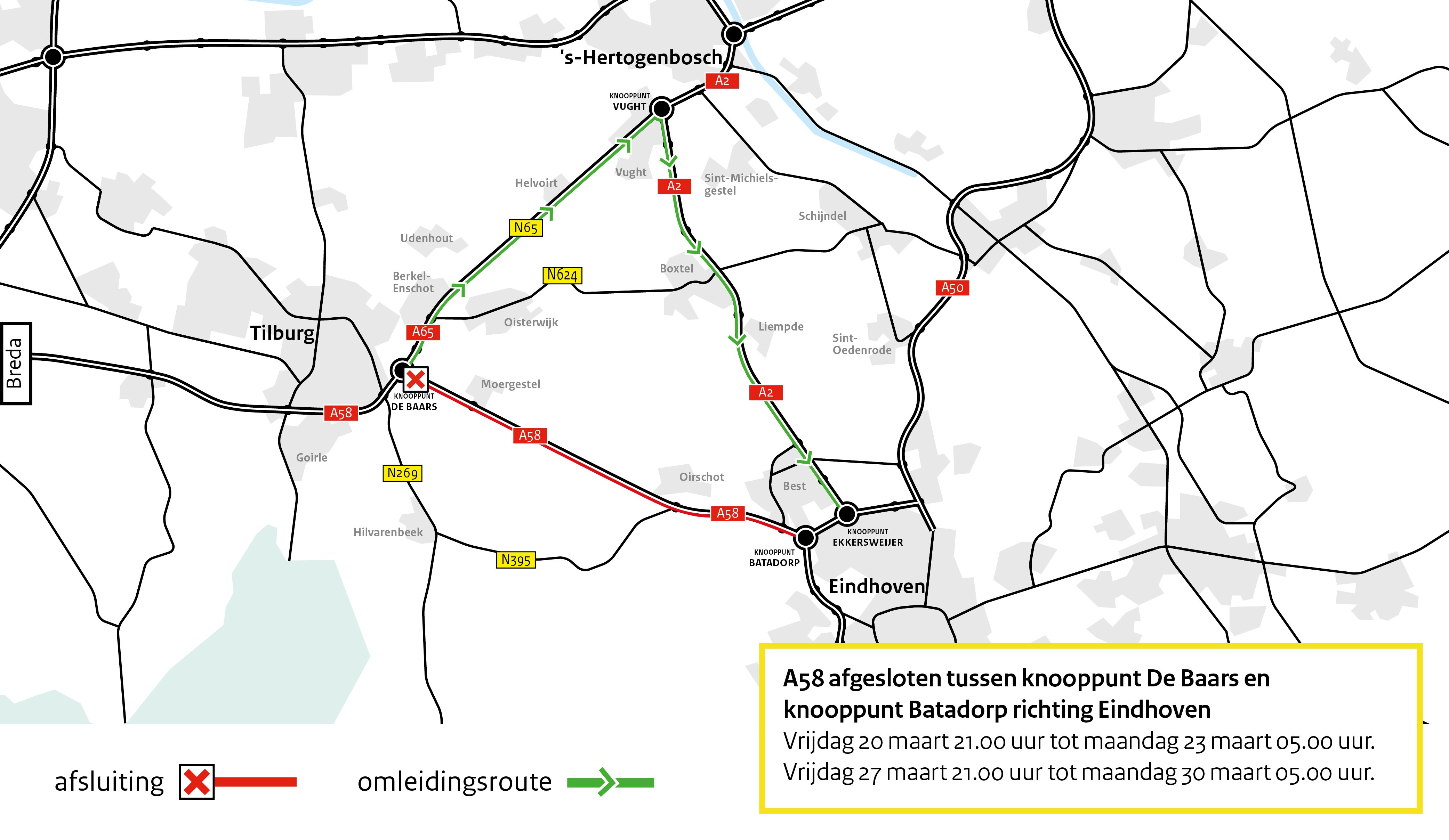 - Tijdens het derde en het vierde weekend is de A58 dicht tussen knooppunt Tilburg (De Baars) en afrit Best in de richting van Eindhoven.