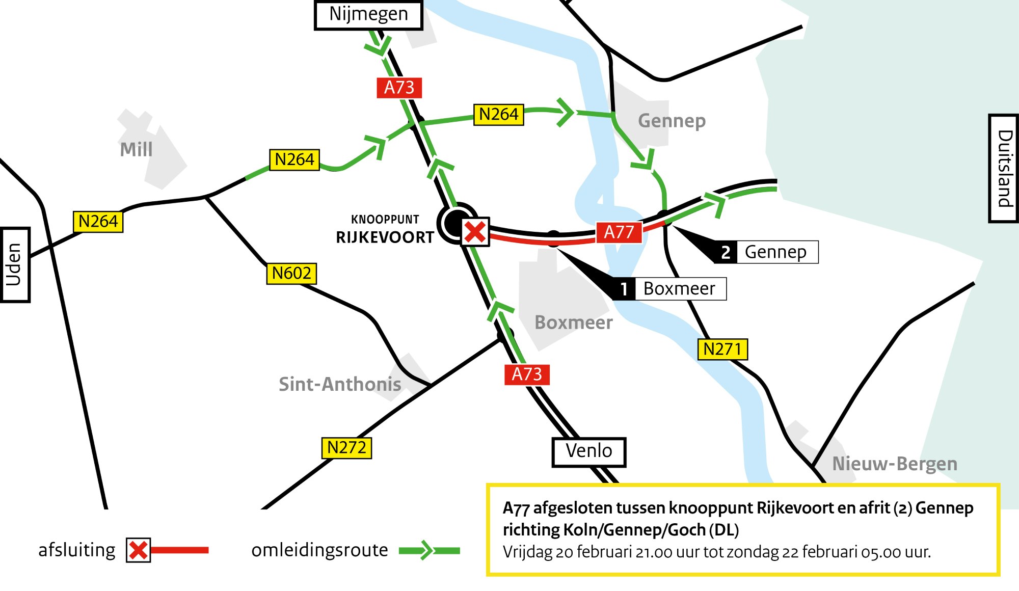 A77: afsluiting tussen knooppunt Rijkevoort en afrit Gennep (2); 20 - 22 februari 2026