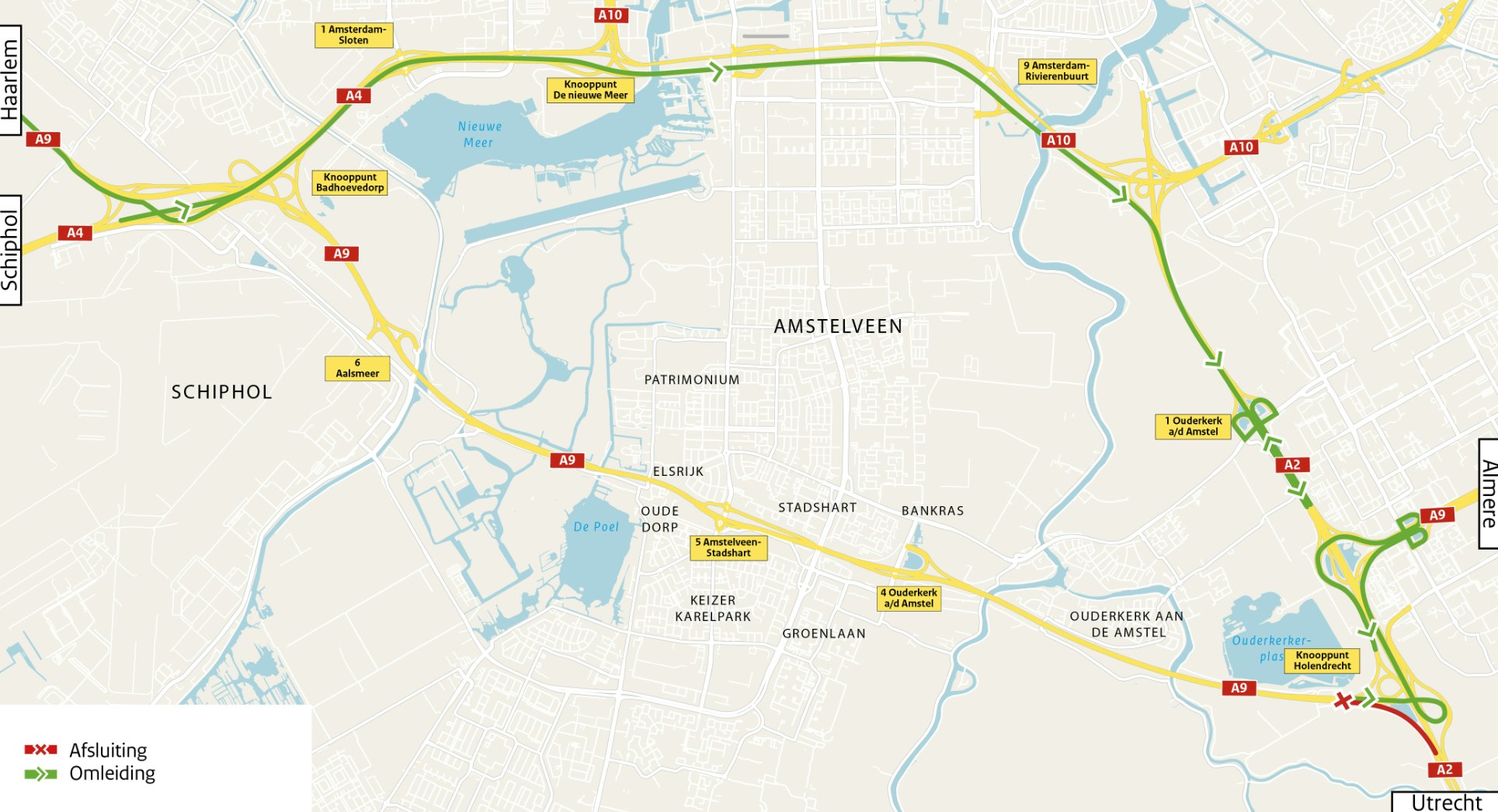 In verband met de verbreding en verdiepte aanleg van de A9 tussen de knooppunten Badhoevedorp en Holendrecht, is de snelweg verschillende weekenden afgesloten. Ook lokale wegen onder de A9 door zijn tijdens deze werkzaamheden afgesloten. op de website van het Online Bezoekerscentrum vindt u een overzicht van de afsluitingen die op dit moment bekend zijn.