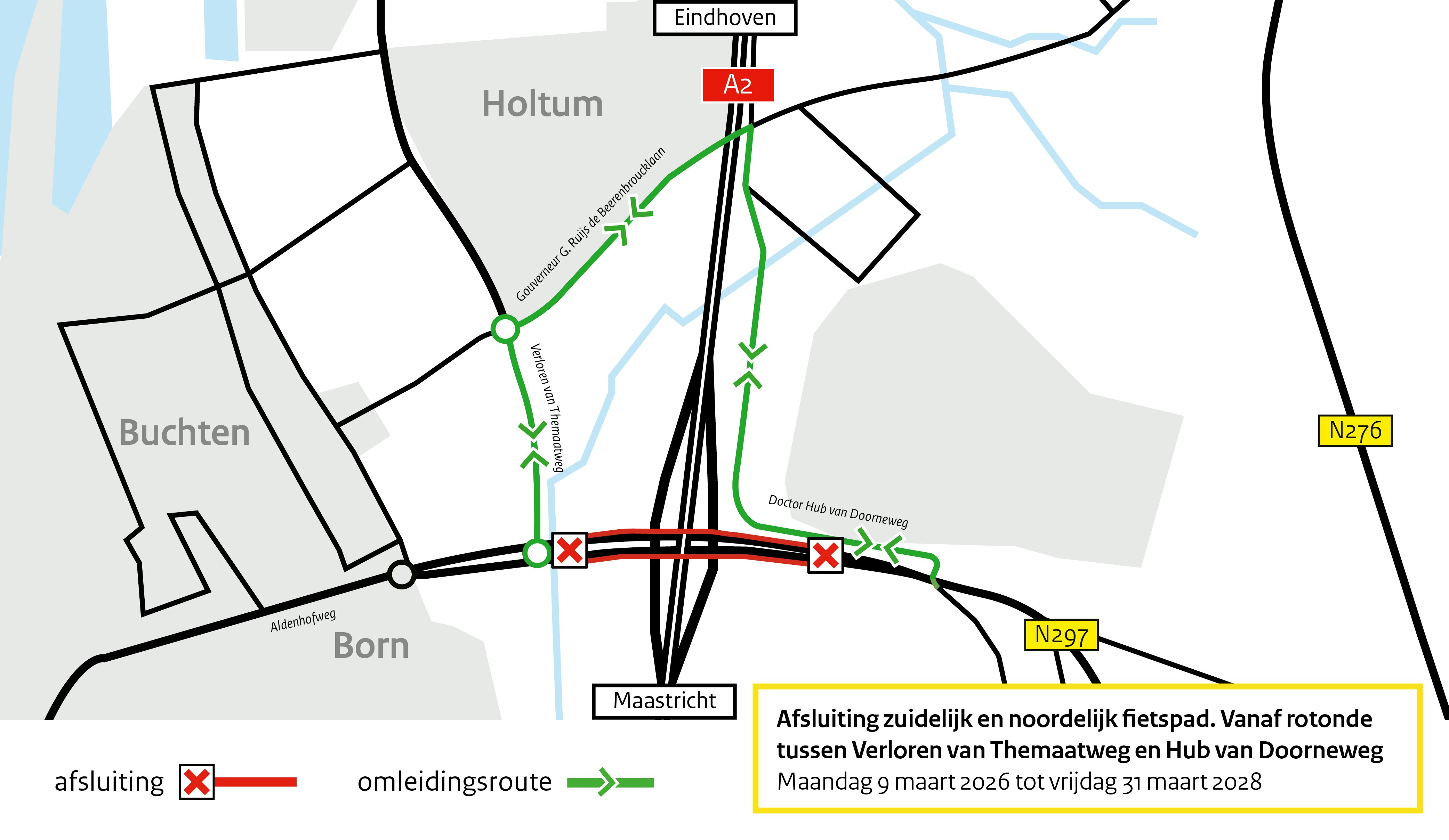 De noordelijke en zuidelijke fietspaden zijn vanaf 9 maart 2026 tot 31 maart 2028 afgesloten tussen de rotonde ter hoogte van de Verloren Themaatweg en de Hub van Doorneweg.