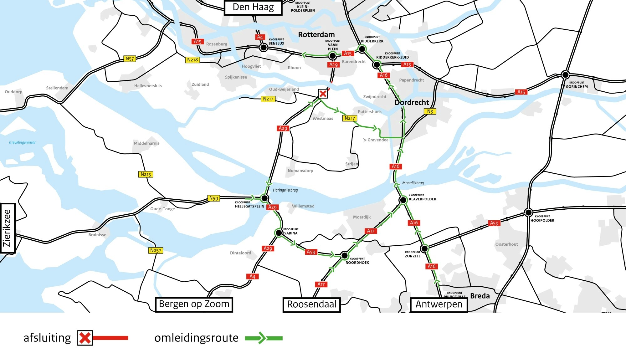 - Doorgaand (vracht)verkeer richting Bergen op Zoom wordt omgeleid via de A15, A16, A17, A59 en A4.