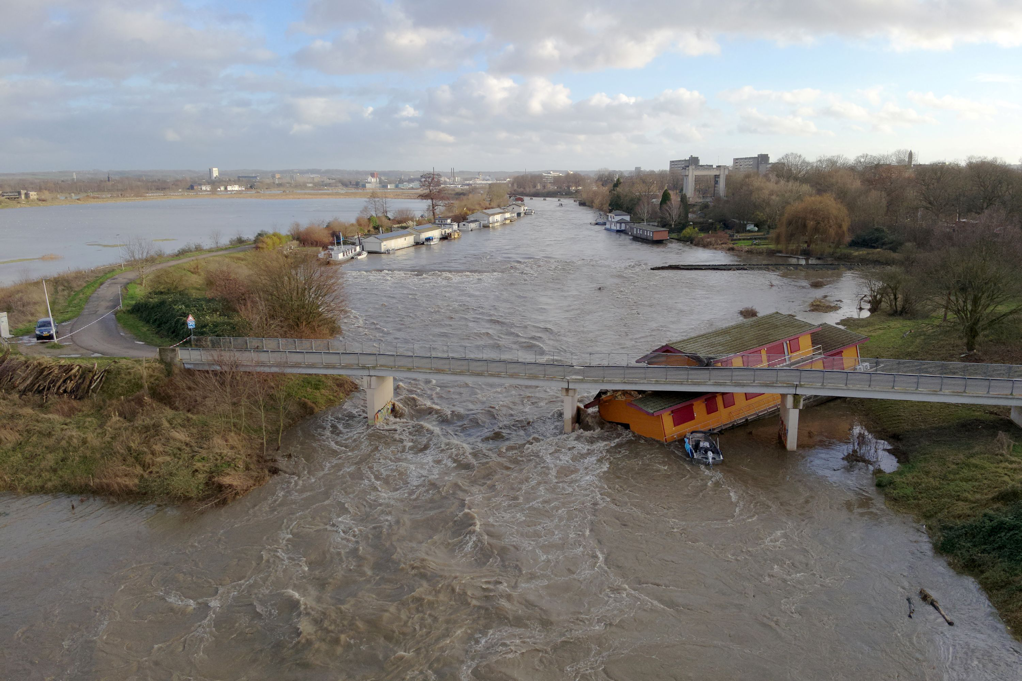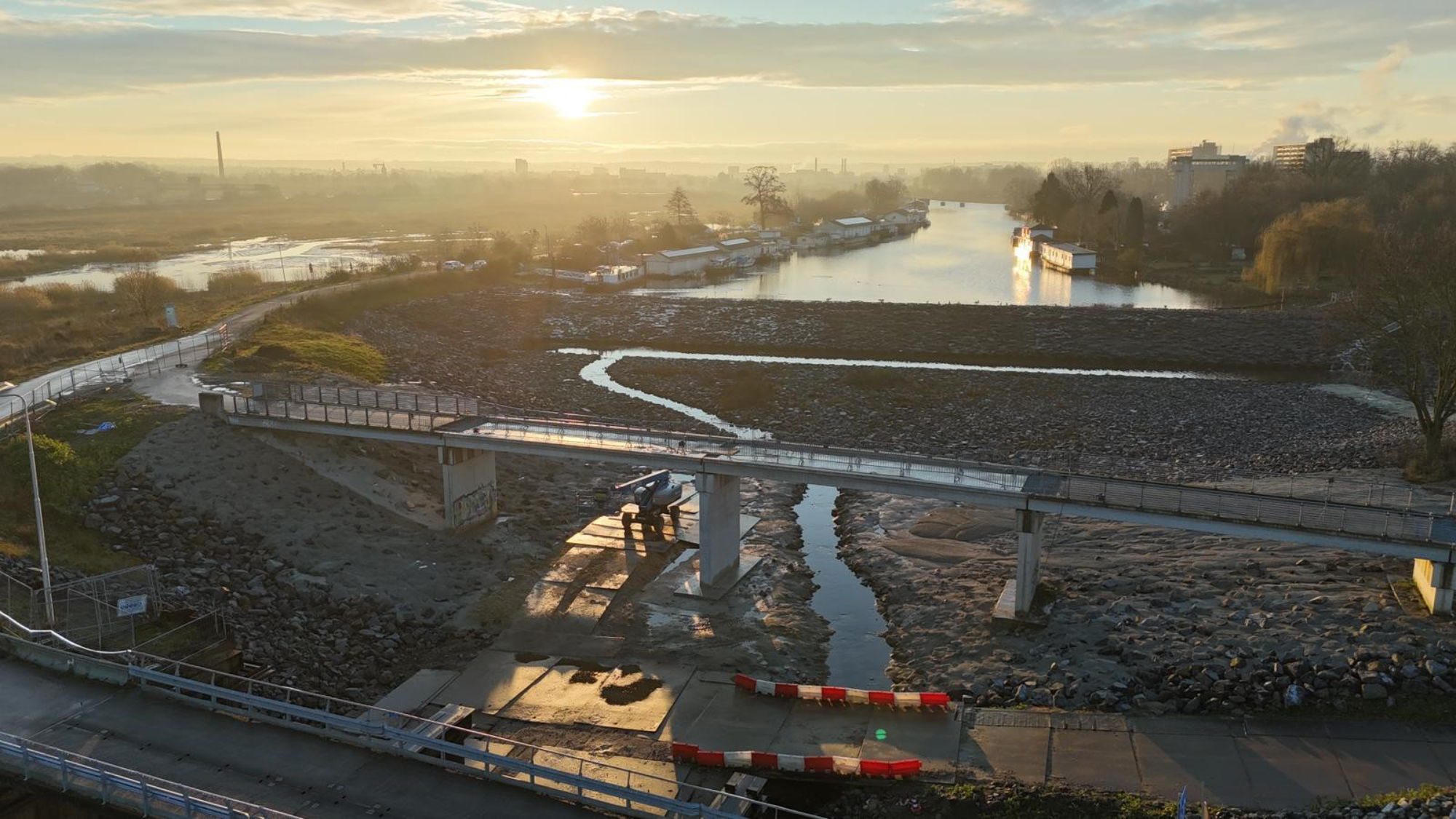 Door een combinatie van factoren brak op 3 januari 2024 een deel van de overlaatdam door. Een woonboot raakte los, dreef weg en botste tegen de Overlaatbrug. De brug liep daarbij flinke schade op. We legden daarom een nieuwe overlaatdam en een noodbrug aan. Nu werken we aan het definitieve herstel van de brug.