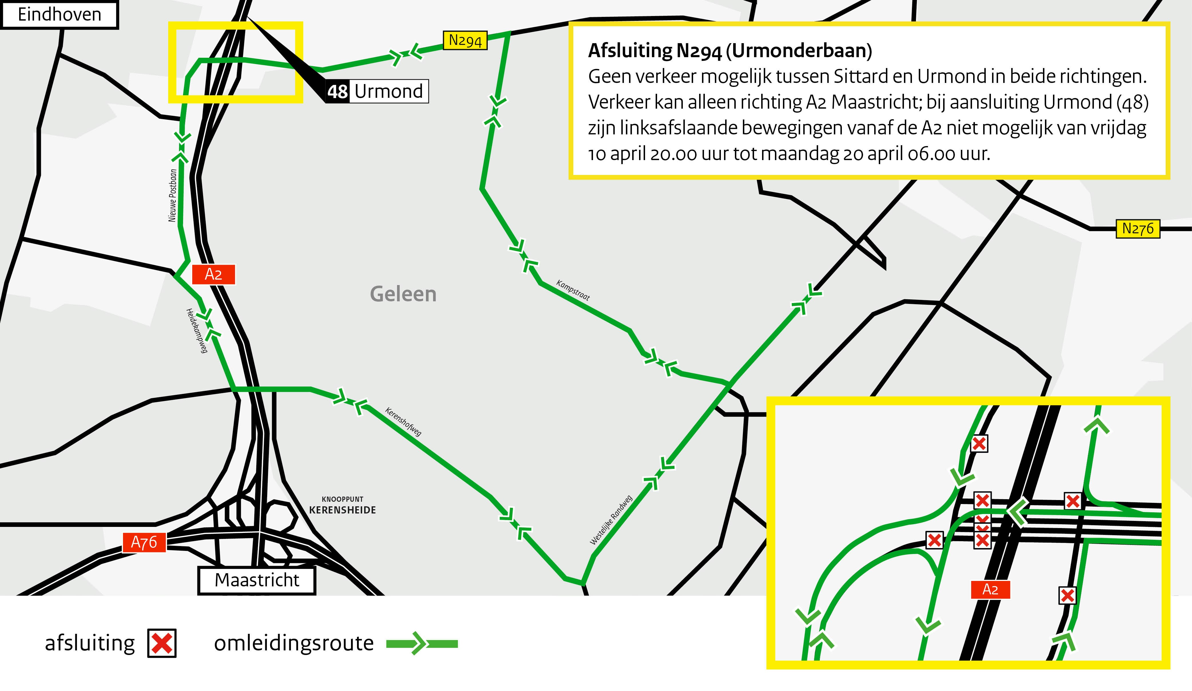 Van vrijdag 10 tot maandag 20 april 2026 vinden er werkzaamheden plaats op de A2 bij de aansluiting Urmond (48). In deze periode zijn delen van de N294 (Urmonderbaan) en delen van de op- en afritten afgesloten. Het verkeer wordt tijdens de werkzaamheden omgeleid. Houd rekening met extra reistijd van 10 tot 20 minuten.