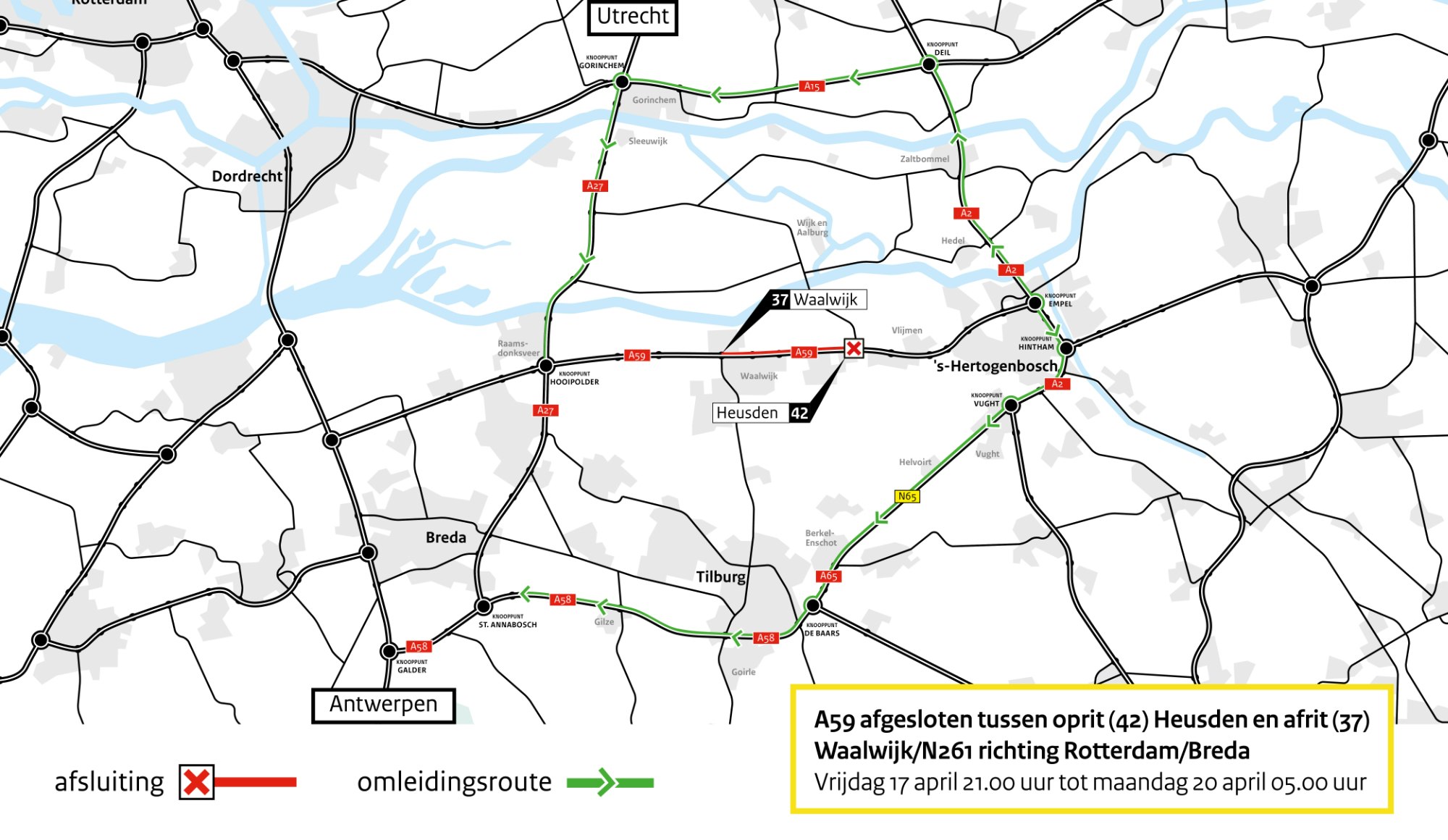 Van vrijdag 17 tot maandag 20 april 2026 werkt Rijkswaterstaat een weekend aan de A59. Tussen Heusden en Waalwijk in de richting van Rotterdam en Breda is de weg dan dicht. Houd rekening met maximaal 30 minuten extra reistijd.