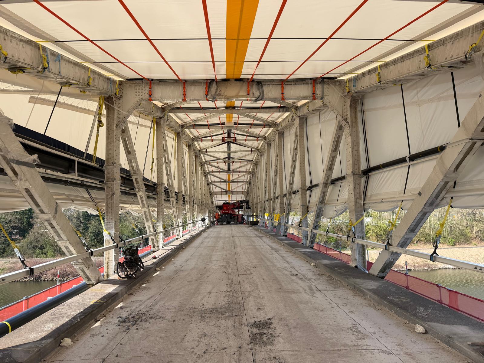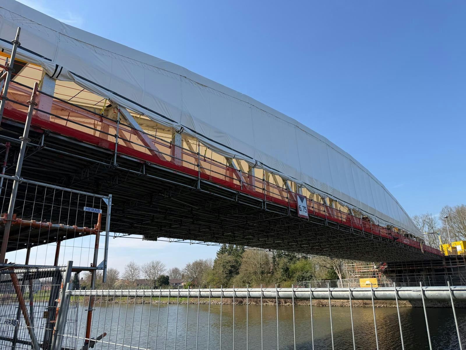 Rondom de brug staat een grote tentconstructie. Deze vangt stof, straalgrit en roestdeeltjes op, zodat dit materiaal niet in de omgeving terechtkomt.