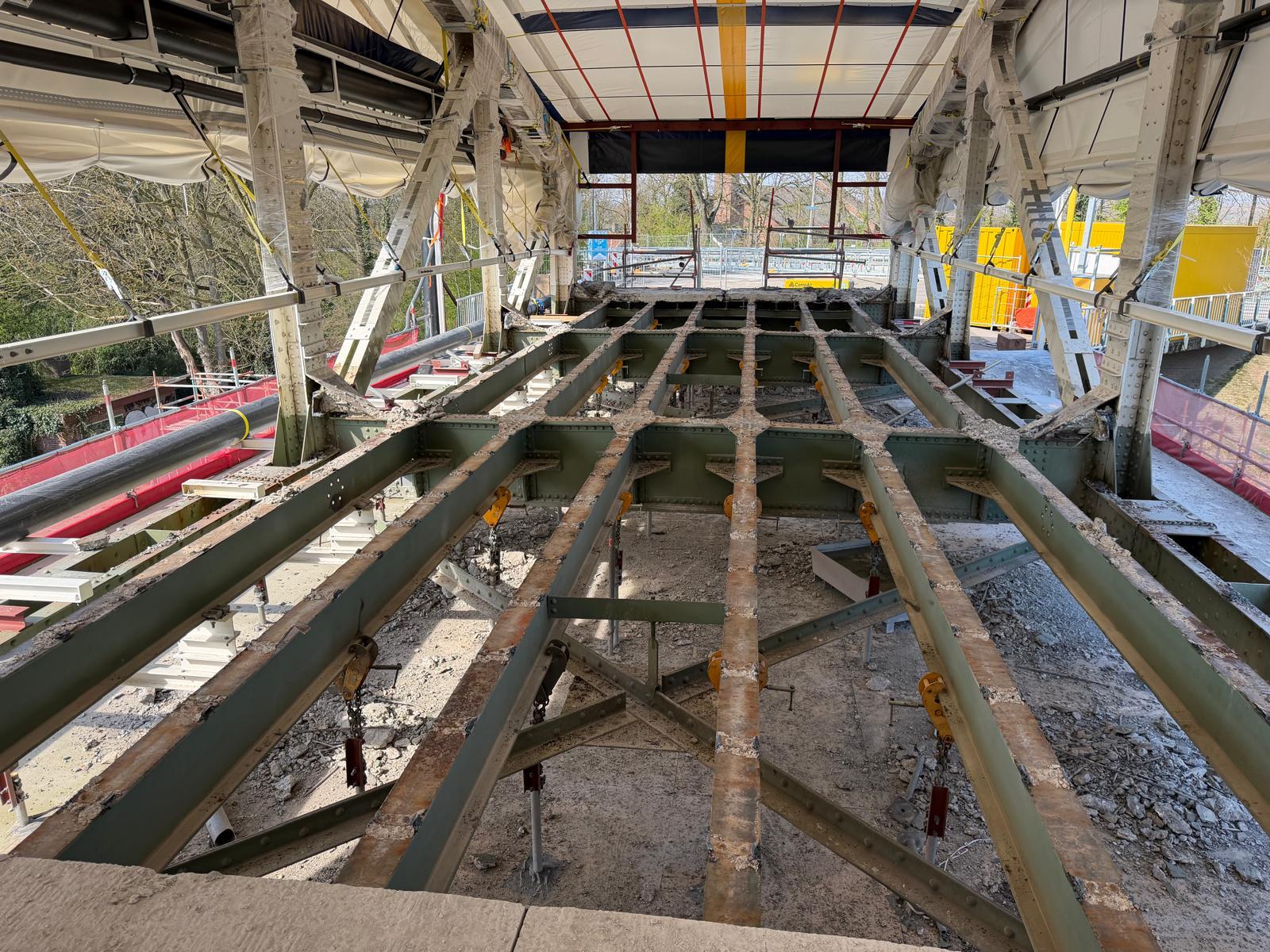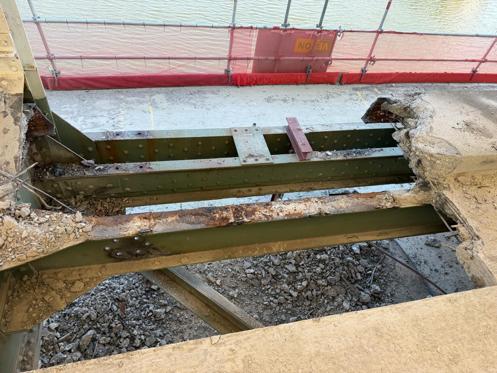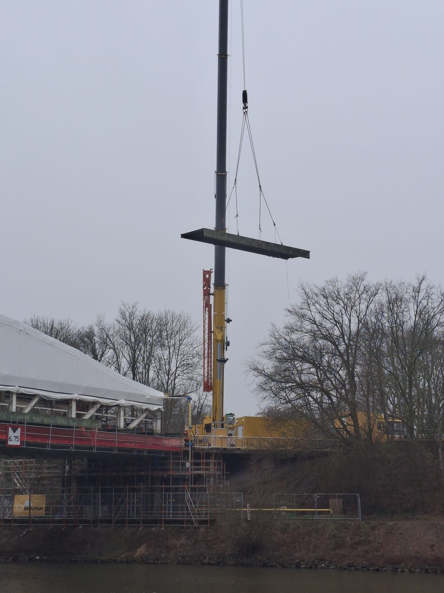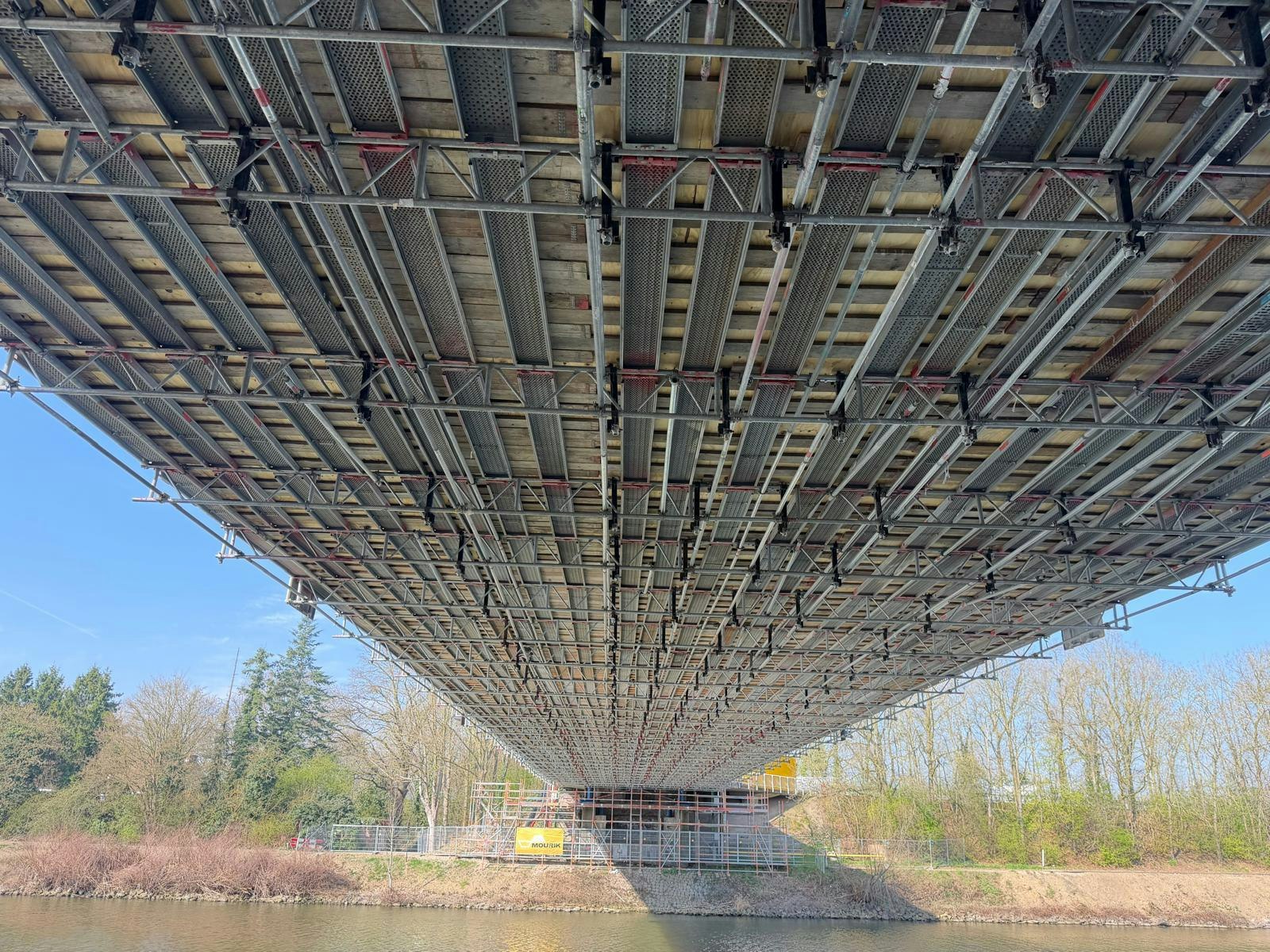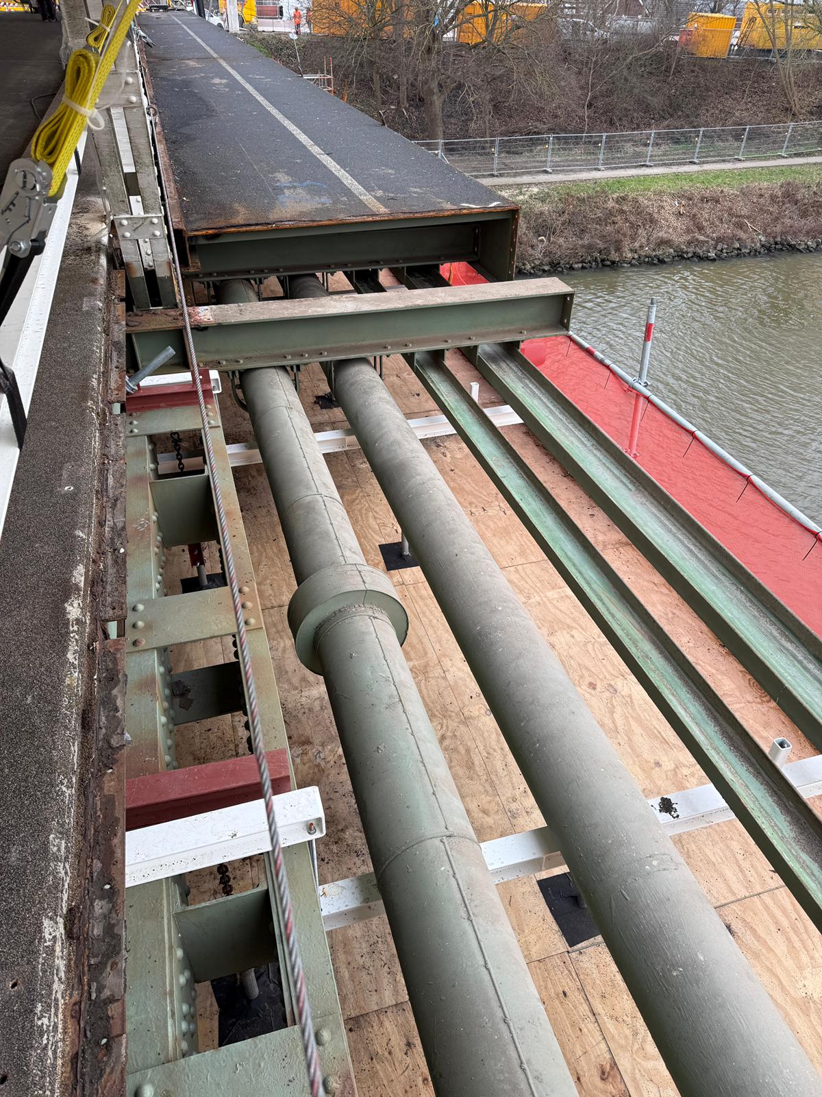 De werksteiger onder brug Urmond is inmiddels goed zichtbaar. Dankzij deze steiger kan de aannemer veilig aan de brug werken, terwijl de scheepvaart gewoon doorvaart. Een slimme en efficiënte oplossing die veel overlast voorkomt.