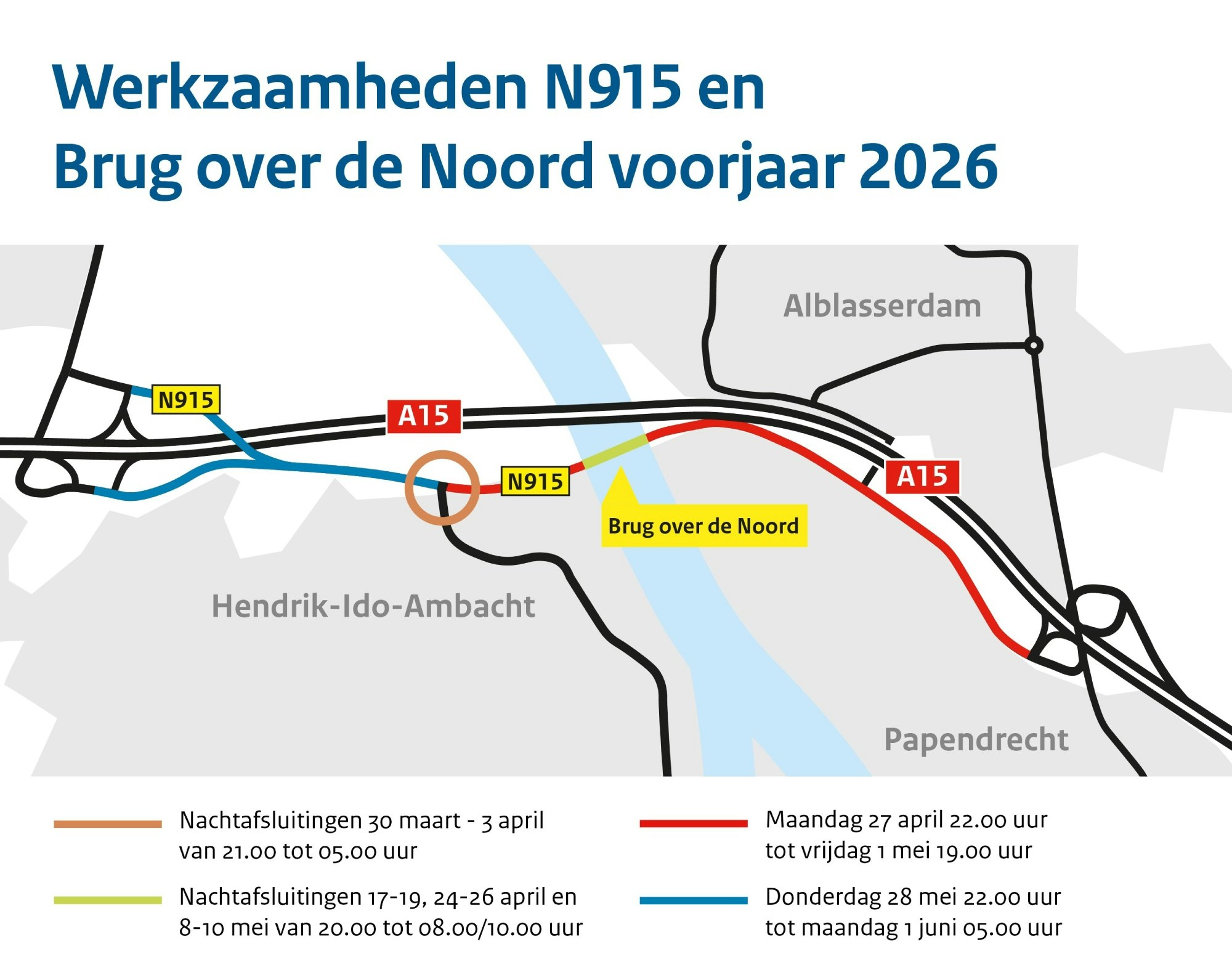 De N915 is in beide richtingen dicht voor autoverkeer, tussen Noordeinde en op- en afrit Hendrik-Ido-Ambacht (21) van de A15. De Brug over de Noord, de kruising Noordeinde en alle op- en afritten van de A15 blijven open.