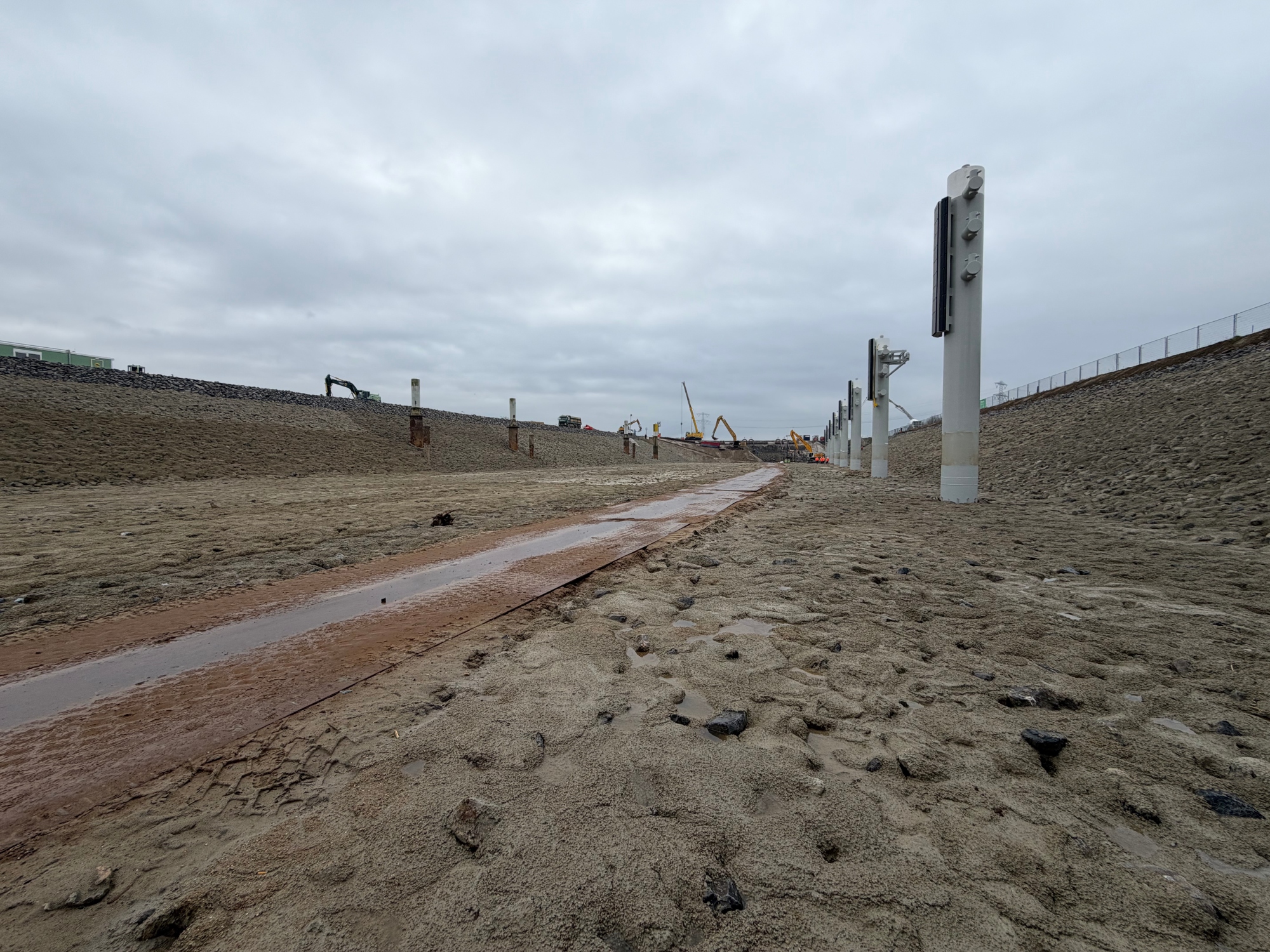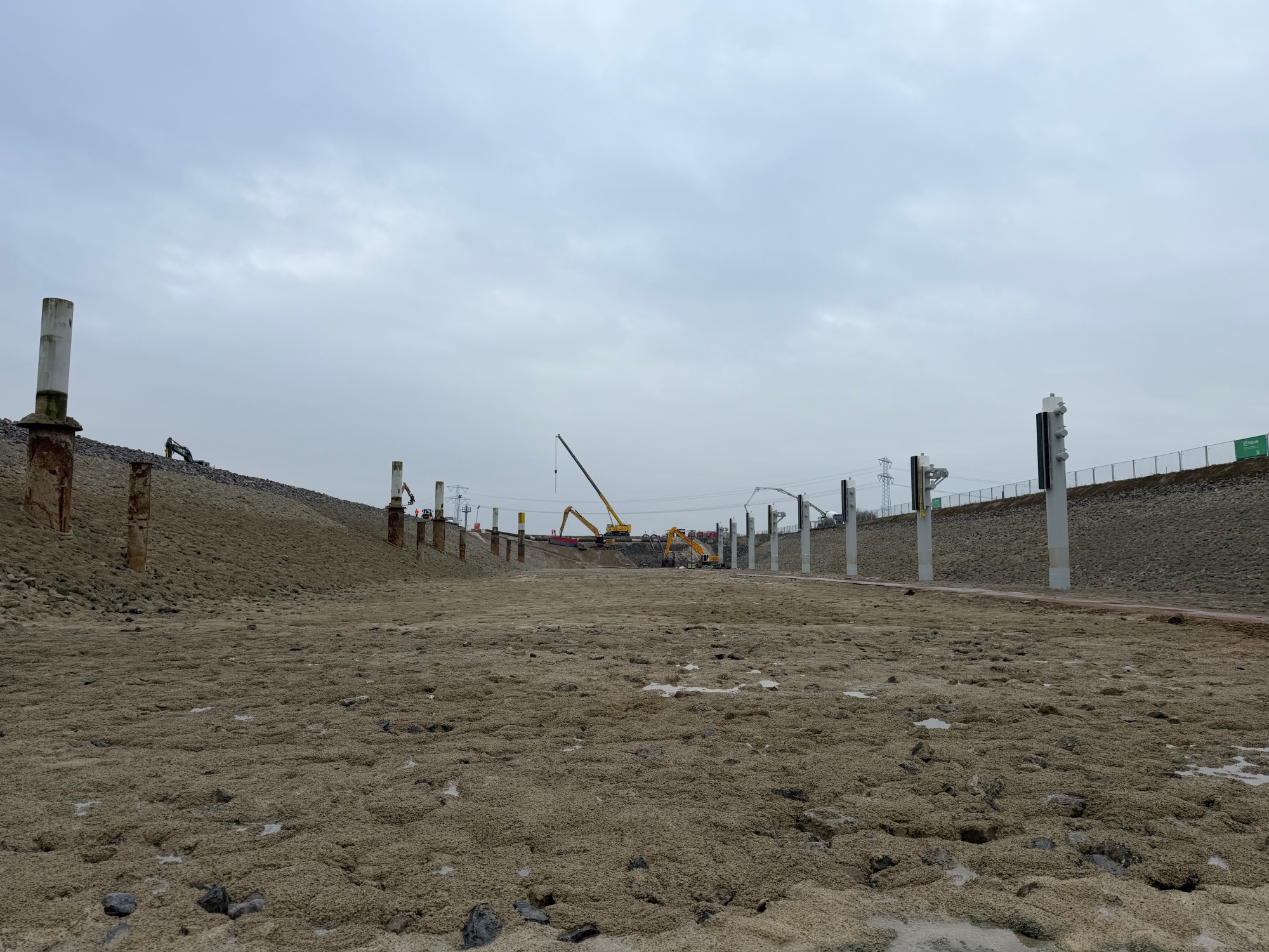 De laatste maanden is al het slib weggehaald dat hier tijdens het verruimingsproject lag opgeslagen. Daarna is alles glad gemaakt en brachten we een laag bodembescherming aan. Deze bestaat, net als in het kanaal, uit een opbouw van matten, grind en stortsteen.