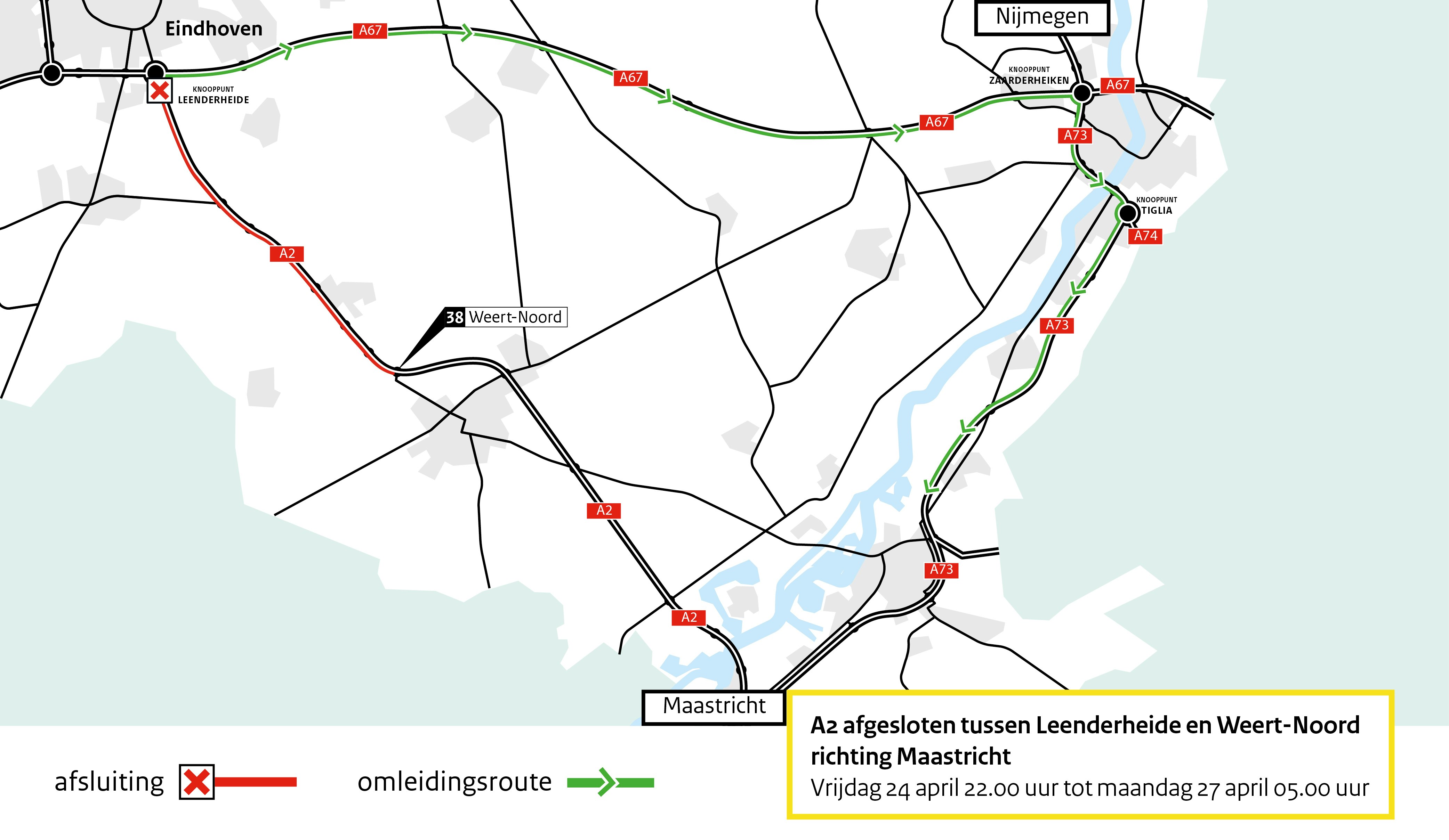In het weekend van 24 tot 27 april 2026 werkt Rijkswaterstaat aan de A2. De weg is dan dicht tussen Eindhoven en Weert richting Maastricht. Houd rekening met maximaal 30 minuten extra reistijd.