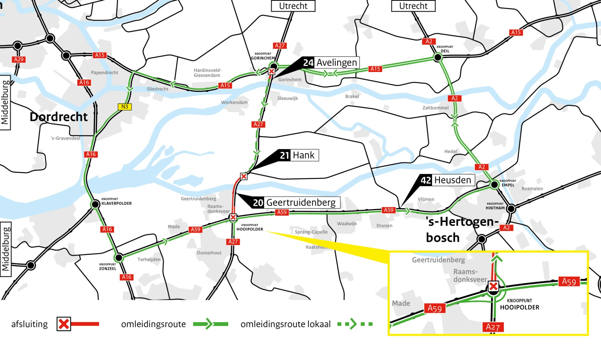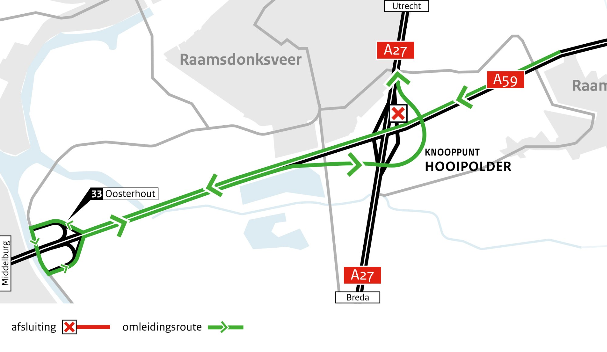 - De A27 richting Utrecht is dicht tussen knooppunt Hooipolder en afrit Geertruidenberg (20). De verbindingsboog van de A59 uit Zeeland naar de A27 richting Utrecht is wel open.