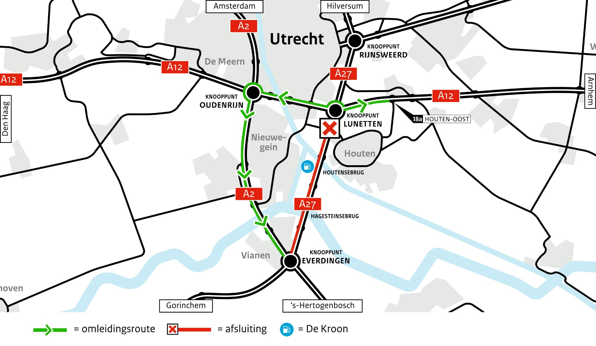 In mei 2026 voeren aannemerscombinatie ALSÉÉN en De Groene Waarden in opdracht van Rijkswaterstaat werkzaamheden uit voor de verbetering van de A27 Houten - Hooipolder. Hiervoor is de A27 een aantal weekenden en nachten dicht.