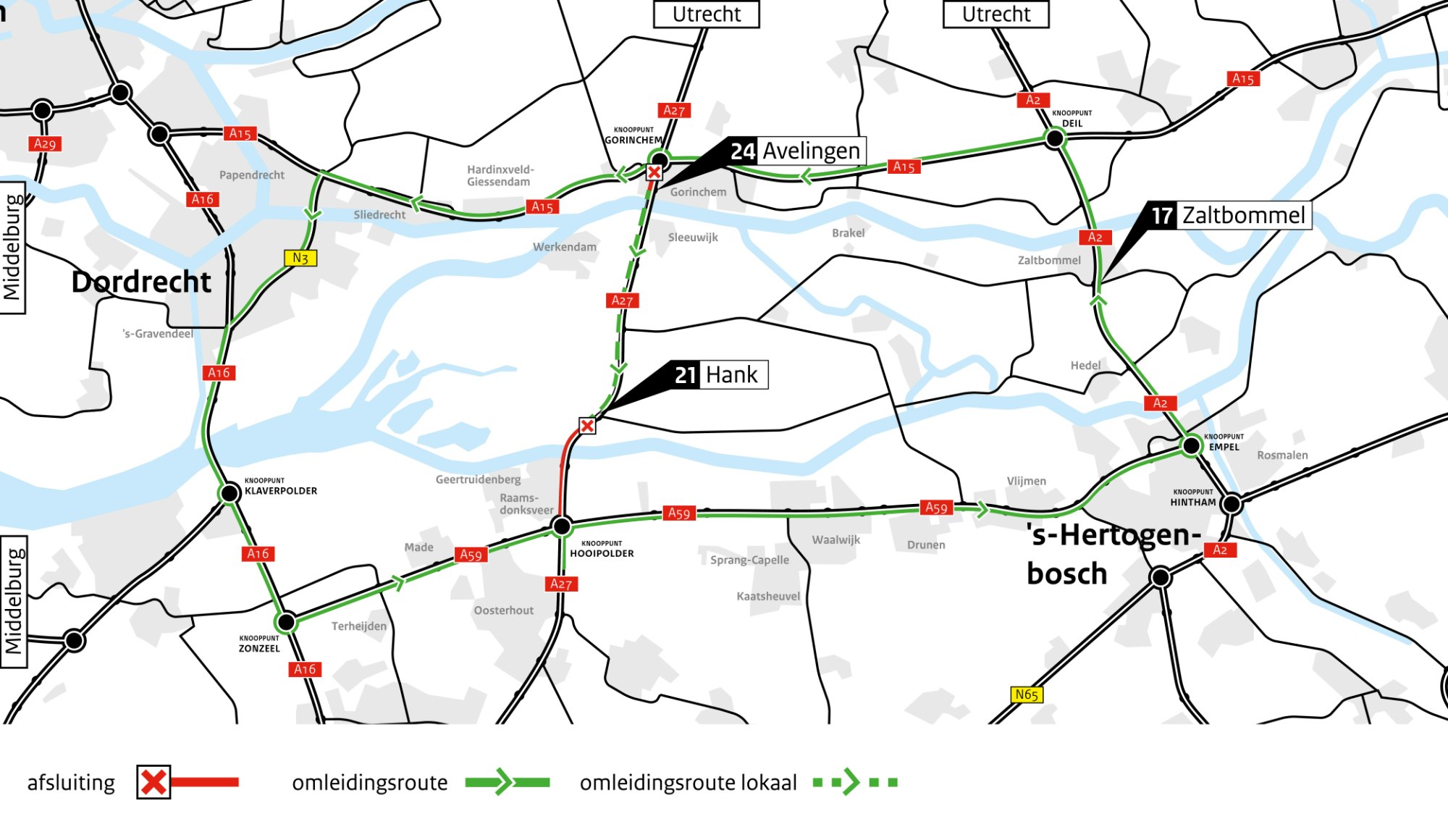 Doorgaand verkeer richting Breda wordt omgeleid vanaf knooppunt Gorinchem via de A15, N3, A16 en A59 of via de A15, A2 en A59. Lokaal verkeer met een bestemming in de gemeente Altena kan via oprit Avelingen (24) rijden.
