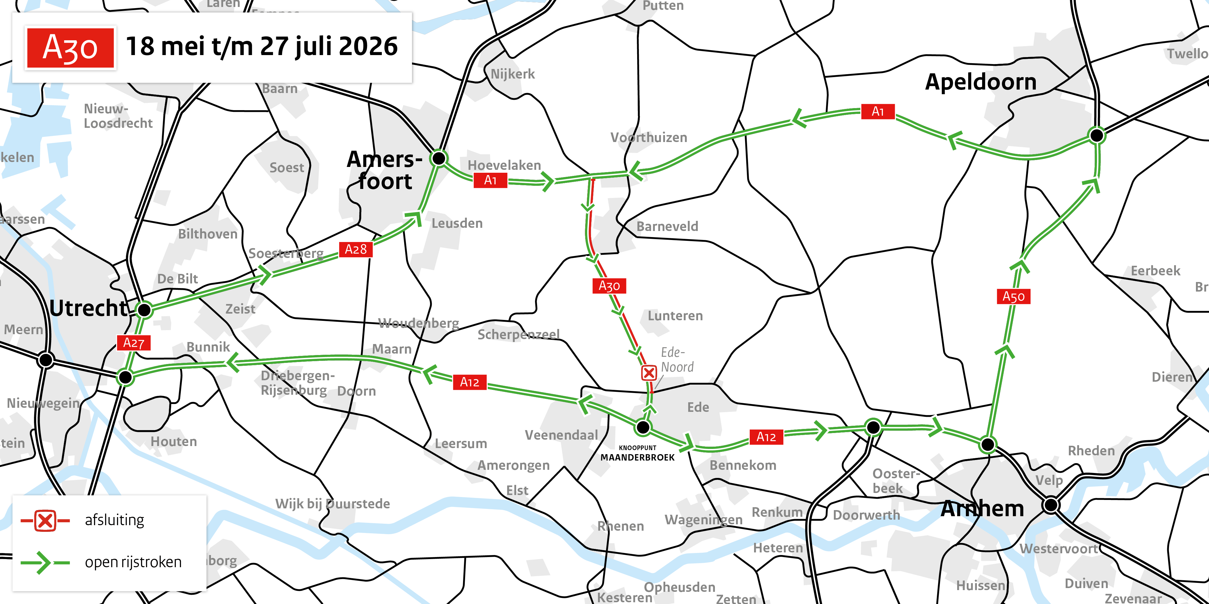 Van 18 mei tot en met 27 juli 2026 voert Rijkswaterstaat de tweede fase uit van het groot onderhoud aan de A30 tussen Barneveld en Lunteren. In deze periode is de A30 afgesloten in noordelijke richting (van Ede-Noord naar aansluiting A1 bij Barneveld). Houd rekening met omleidingen en een extra reistijd van 40 tot 60 minuten.