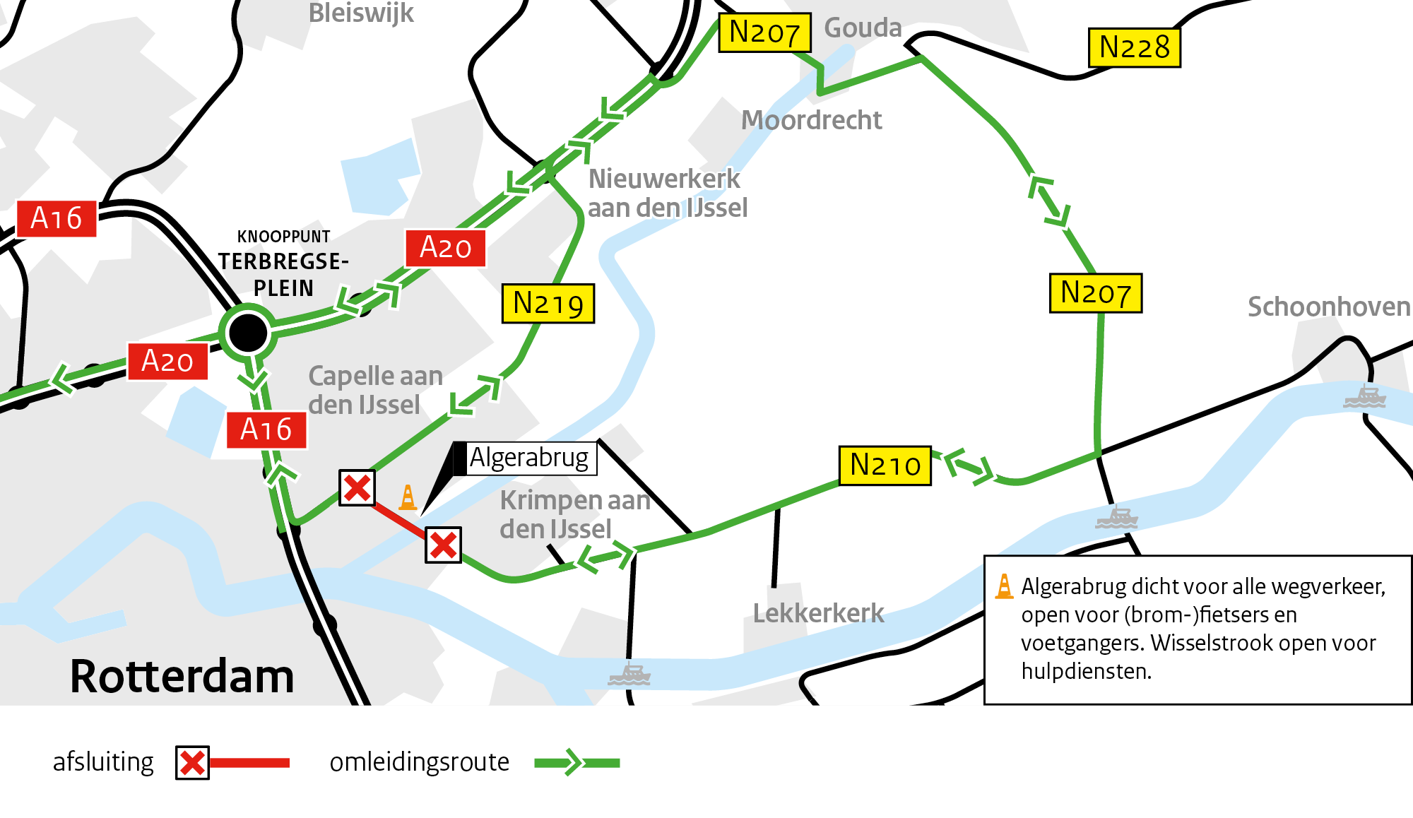 Rijkswaterstaat zorgt samen met Zuid-Holland Bereikbaar, gemeentes en vervoerspartners voor nieuwe reismogelijkheden tijdens het groot onderhoud aan de Algerabrug (N210), van 10 augustus tot 7 september 2026.