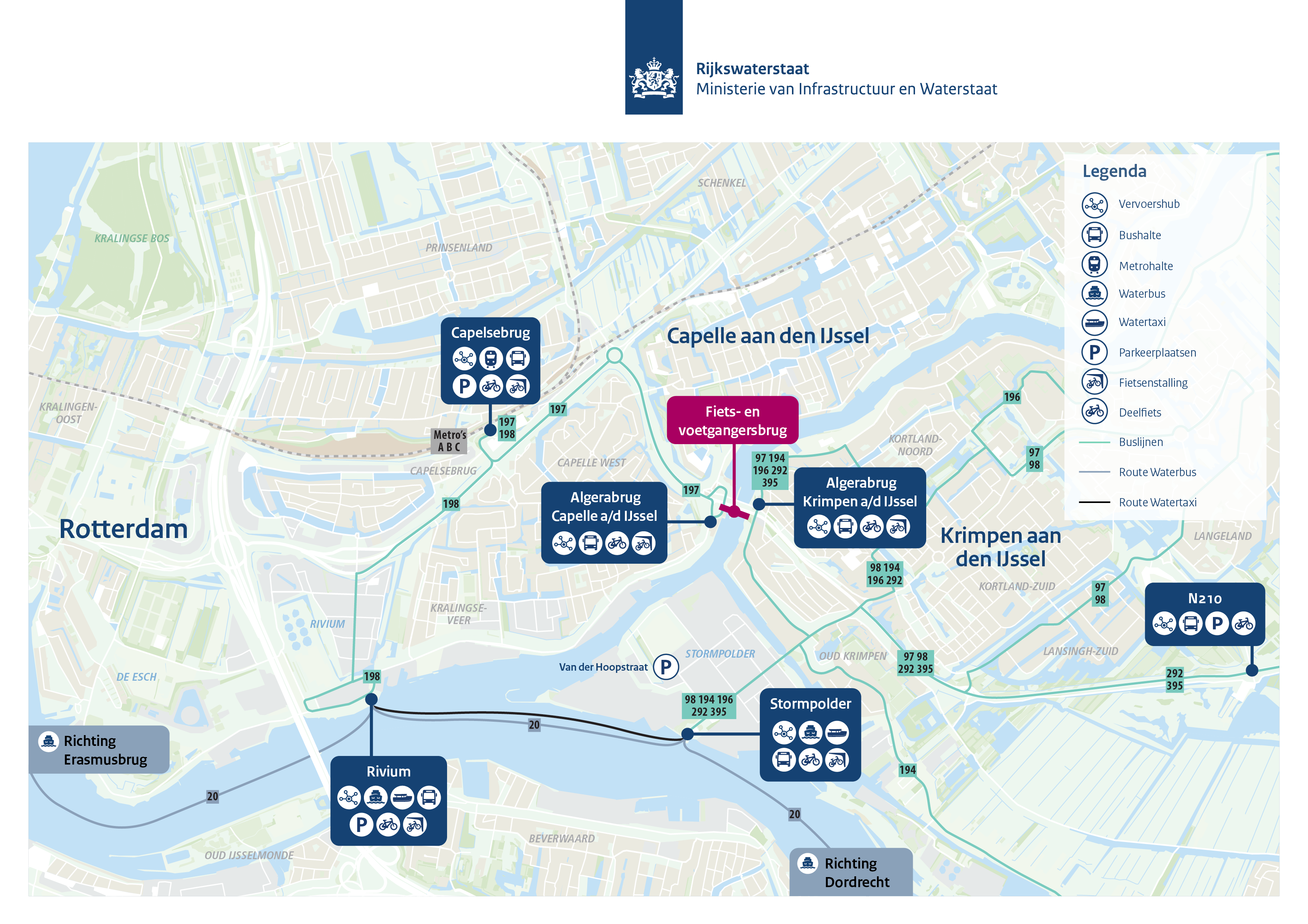 We zorgen er ook voor dat reizigers die nu al met het openbaar vervoer, de fiets of lopend gaan dit kunnen blijven doen als de brug is afgesloten. Speciaal voor hen wordt een tijdelijke (fiets)brug gebouwd. Ook komen er vervoershubs aan beide kanten van de Algerabrug, waar reizigers kunnen overstappen op de (deel)fiets, bus, metro, Waterbus, watertaxi of auto. Daarnaast worden dienstregelingen aangepast of uitgebreid en komen er extra haltes. Zo houden we de regio bereikbaar.