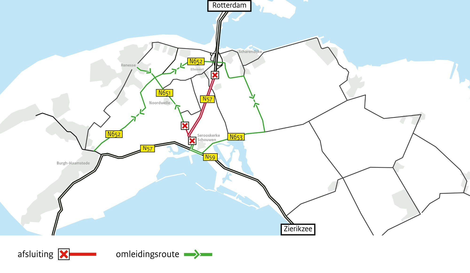 Verkeer vanuit Noordwelle, Ellemeet en Burgh-Haamstede wordt omgeleid via de N652. Verkeer vanuit Serooskerke wordt omgeleid via de N653 en de Elkerzeeseweg. De omleidingsroutes worden met gele borden aangegeven.