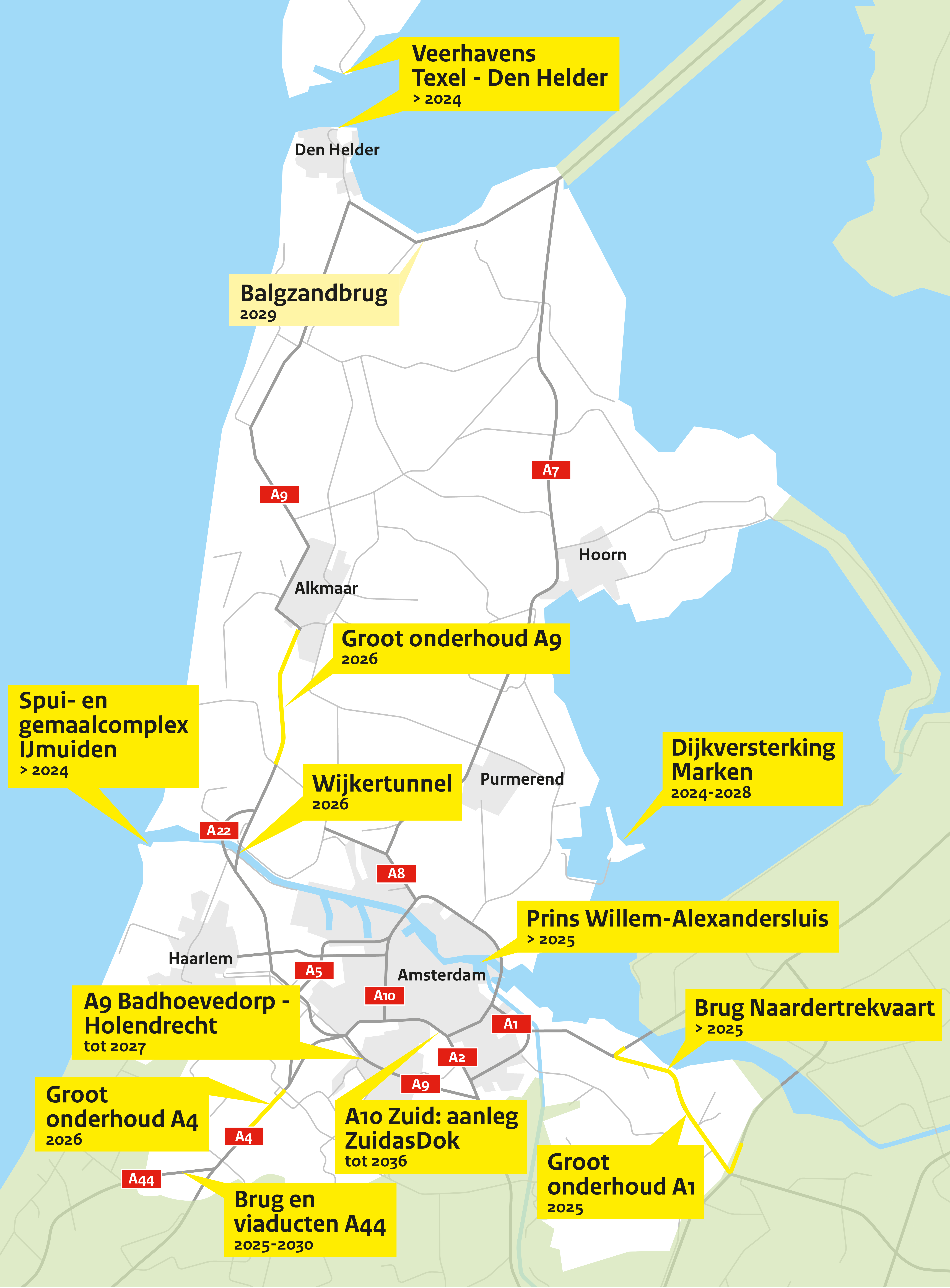 Rijkswaterstaat renoveert en vervangt in Noord-Holland de komende jaren veel infrastructuur, zoals bruggen en viaducten. Ook voeren we op verschillende wegen groot onderhoud uit.