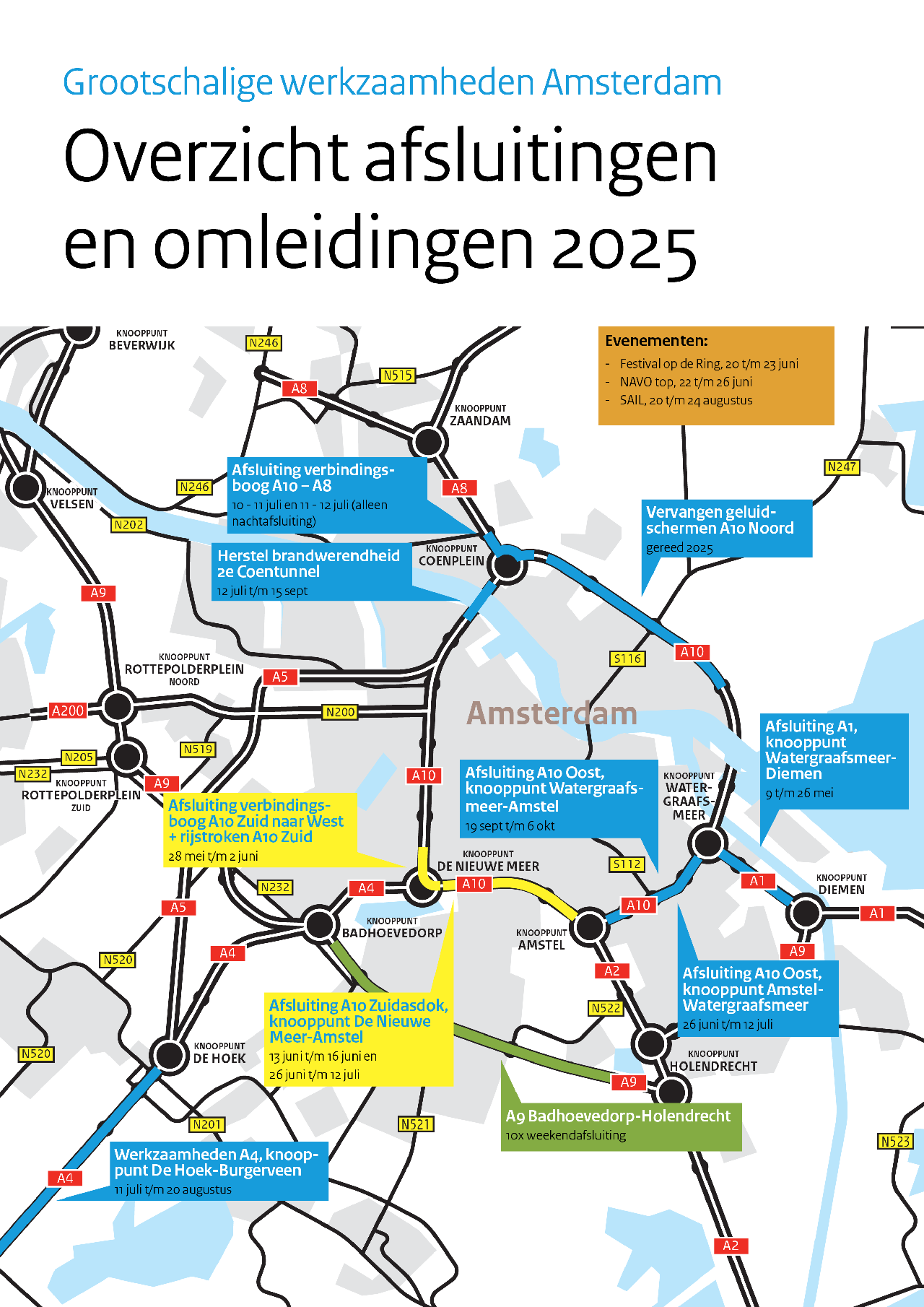 - Voor de verdieping en verbreding van de A9 tussen Badhoevedorp en Holendrecht zijn twaalf weekendafsluitingen nodig tussen februari en oktober.