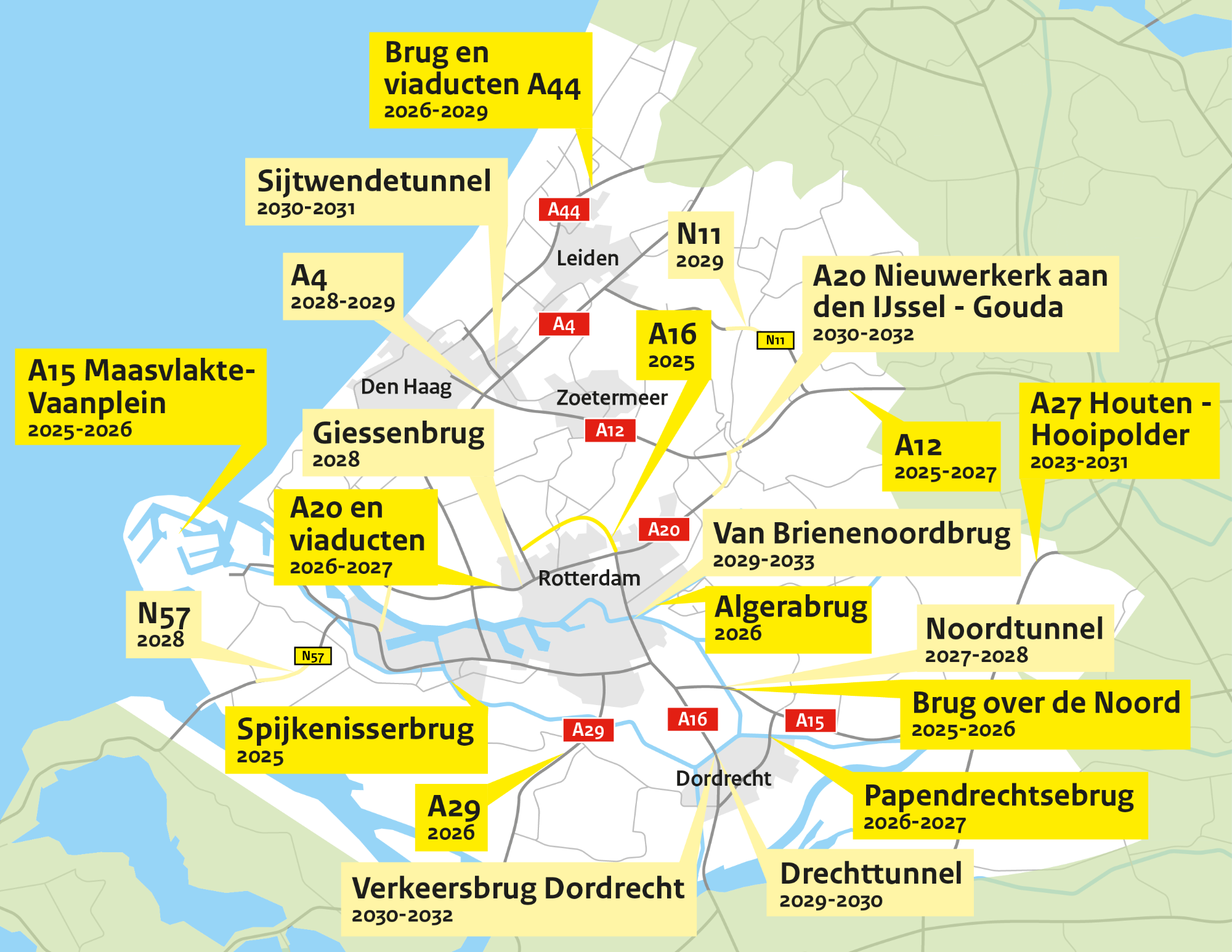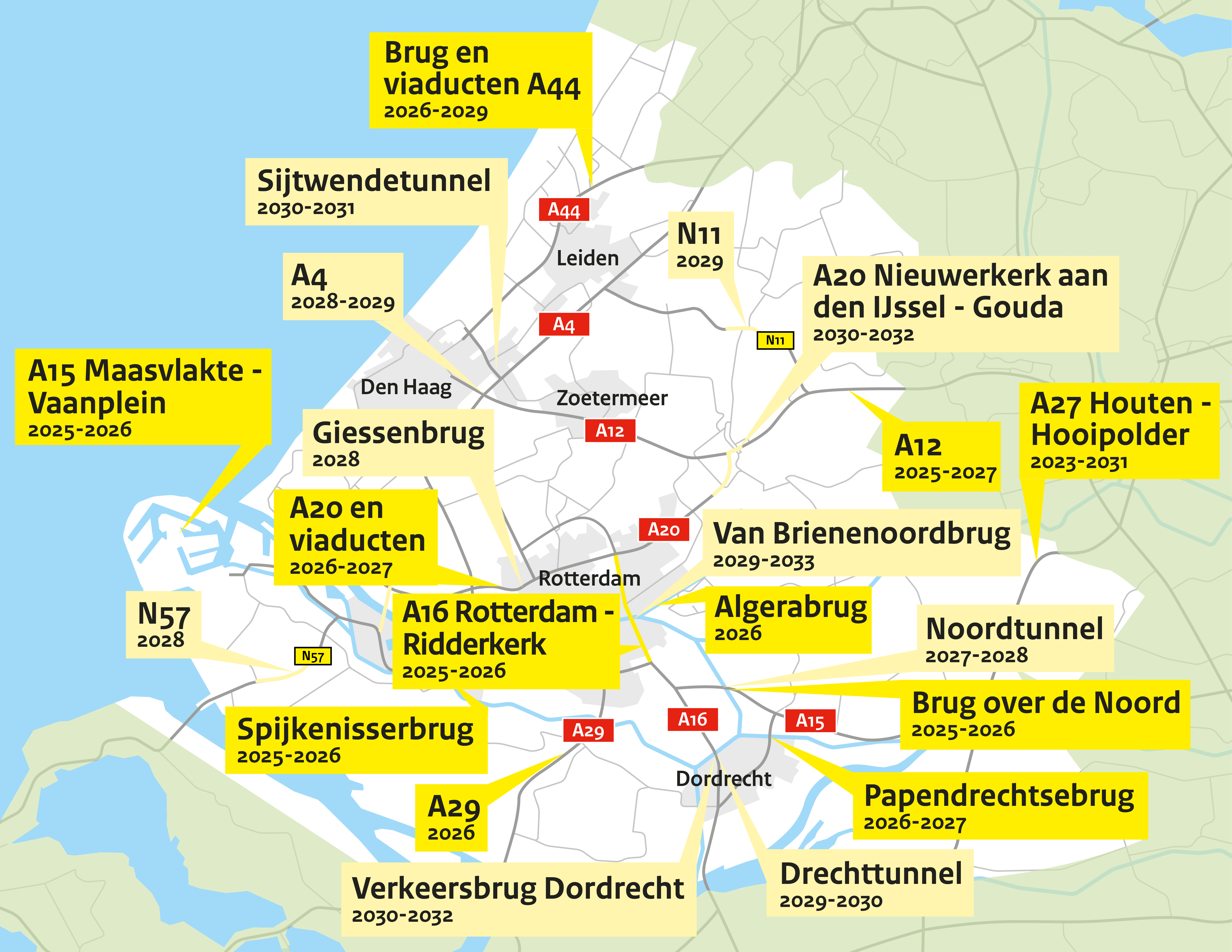 Rijkswaterstaat versterkt en verbetert de komende jaren een flink aantal bruggen, tunnels en viaducten in Zuid-Holland. Ook voeren we op verschillende wegen groot onderhoud uit.