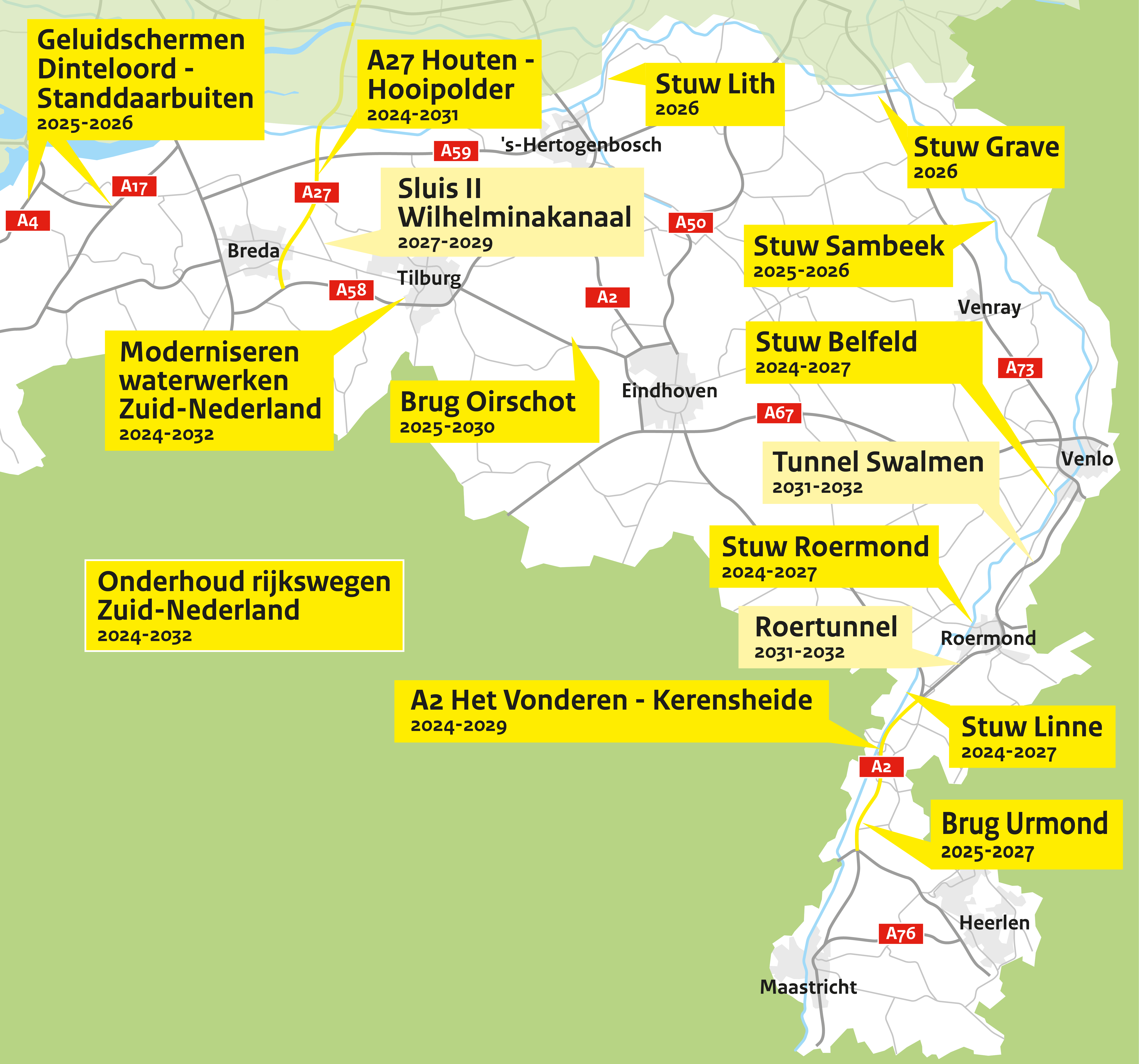 Rijkswaterstaat renoveert en vervangt de komende jaren een flink aantal bruggen, tunnels, viaducten, stuwen en sluizen in Zuid-Nederland. Ook voeren we op bijna alle wegen in onze regio groot onderhoud uit. Denk hierbij aan het vervangen van asfalt, maar ook het maaien van de bermen en reinigen van goten.