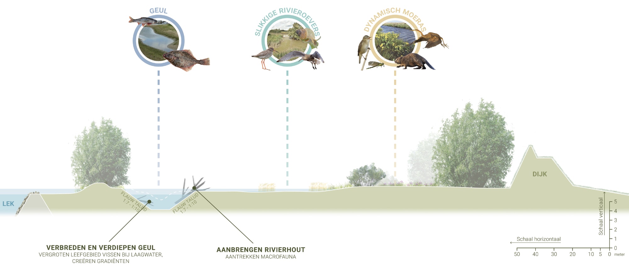 - Aanpassing van de bestaande geul: we passen de geul zo aan dat het water rustiger stroomt en vissen meer beschutte plekken krijgen. Dit doen we door de verbinding tussen de bestaande geul en de rivier te verbeteren en de geul te verdiepen. Daardoor blijft er ook bij lagere waterstanden en tijdens eb voldoende leefgebied voor vissen. Ook plaatsen we rivierhout in de geulen. Dit vormt een leefplaats voor verschillende soorten insecten en vissen.