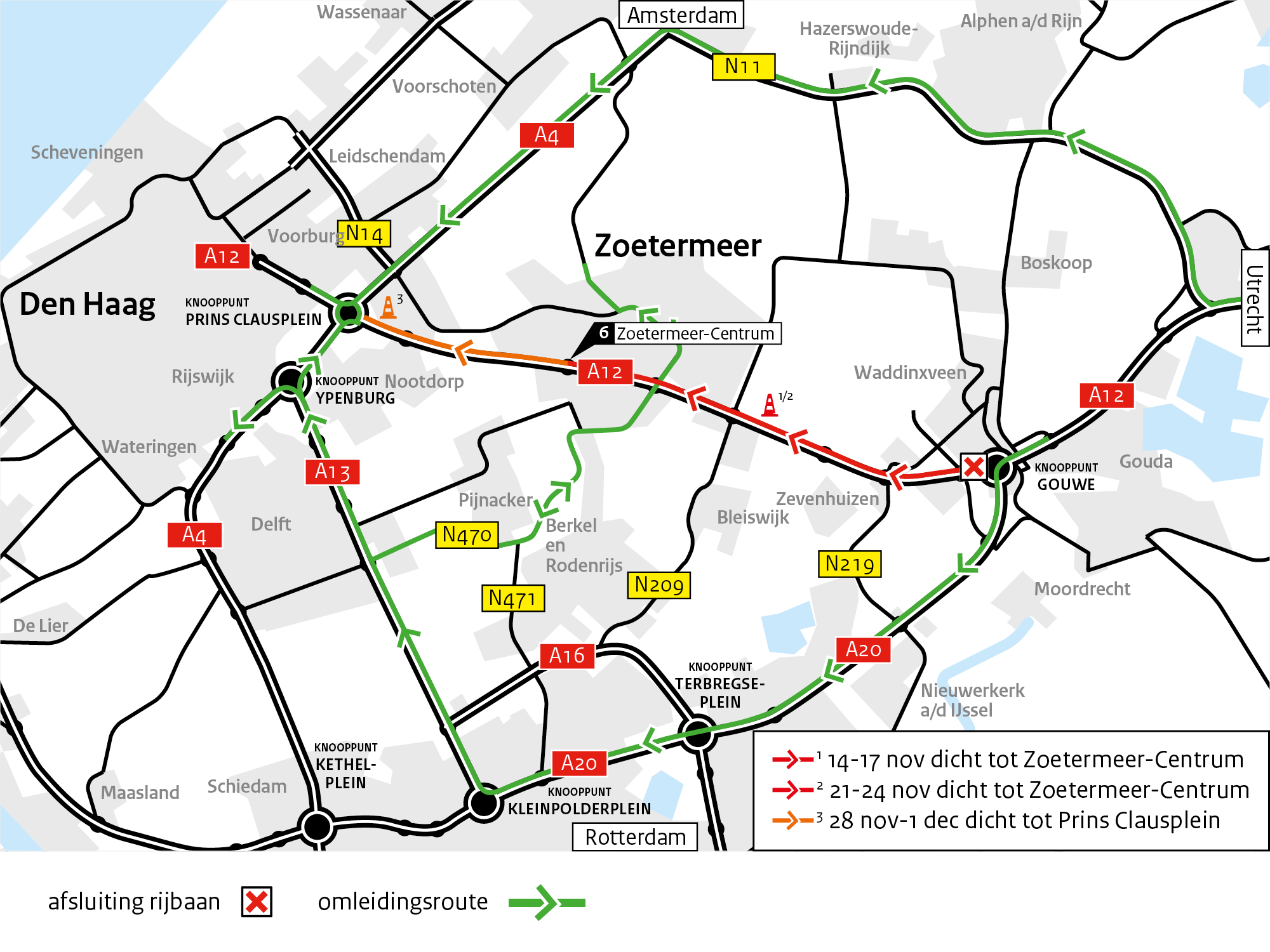 - van vrijdag 21 november 22.00 tot maandag 24 november 05.00 uur tussen knooppunt Gouwe en Zoetermeer-Centrum (6)