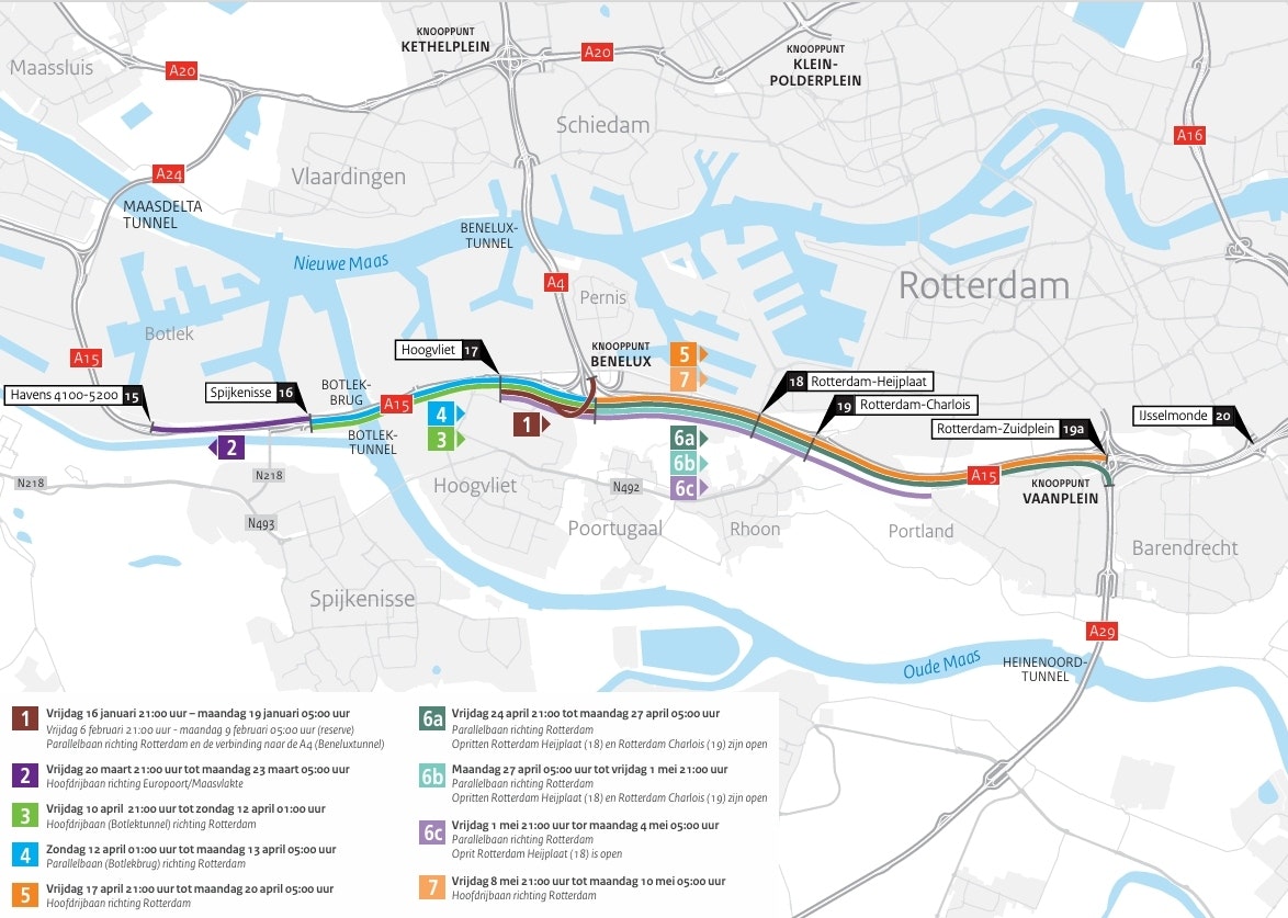 Tussen 22.00 en 05.00 uur de volgende ochtend vinden tijdens het hele jaar onderhoudswerkzaamheden plaats op de A15 tussen Maasvlakte en Vaanplein, de tunnels in de A15 en de Botlekbrug en de A24 (Blankenbrugverbinding).