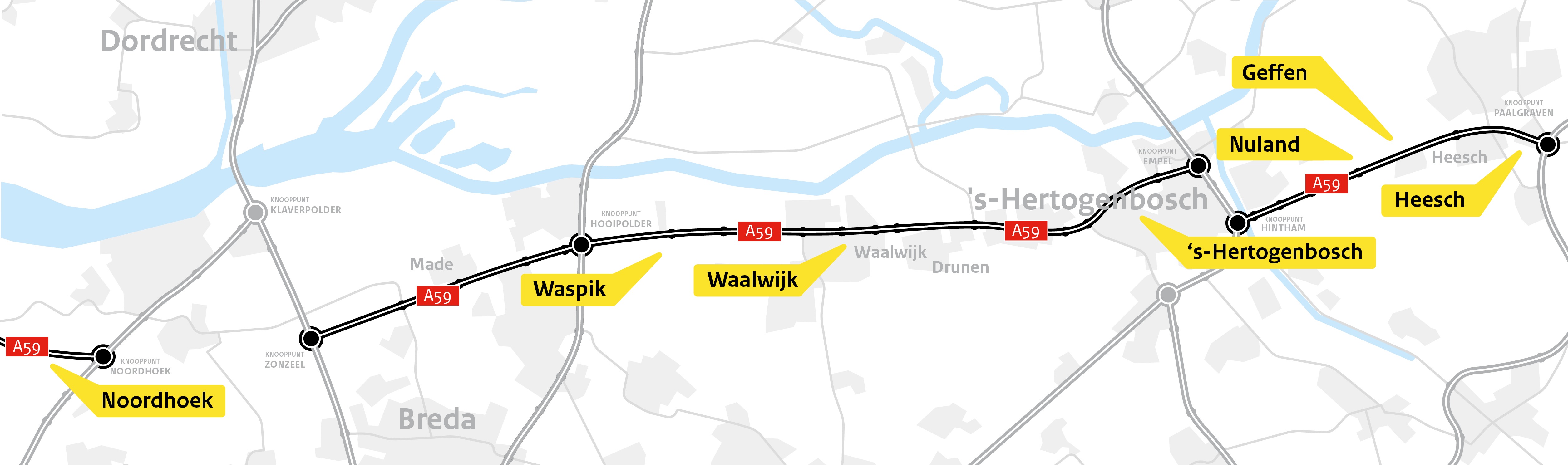 In Noord-Brabant worden langs de A59 in totaal 13 geluidsschermen gerealiseerd. De schermen komen bij de plaatsen Noordhoek, Waspik, Waalwijk, 's-Hertogenbosch, Nuland, Geffen en Heesch.