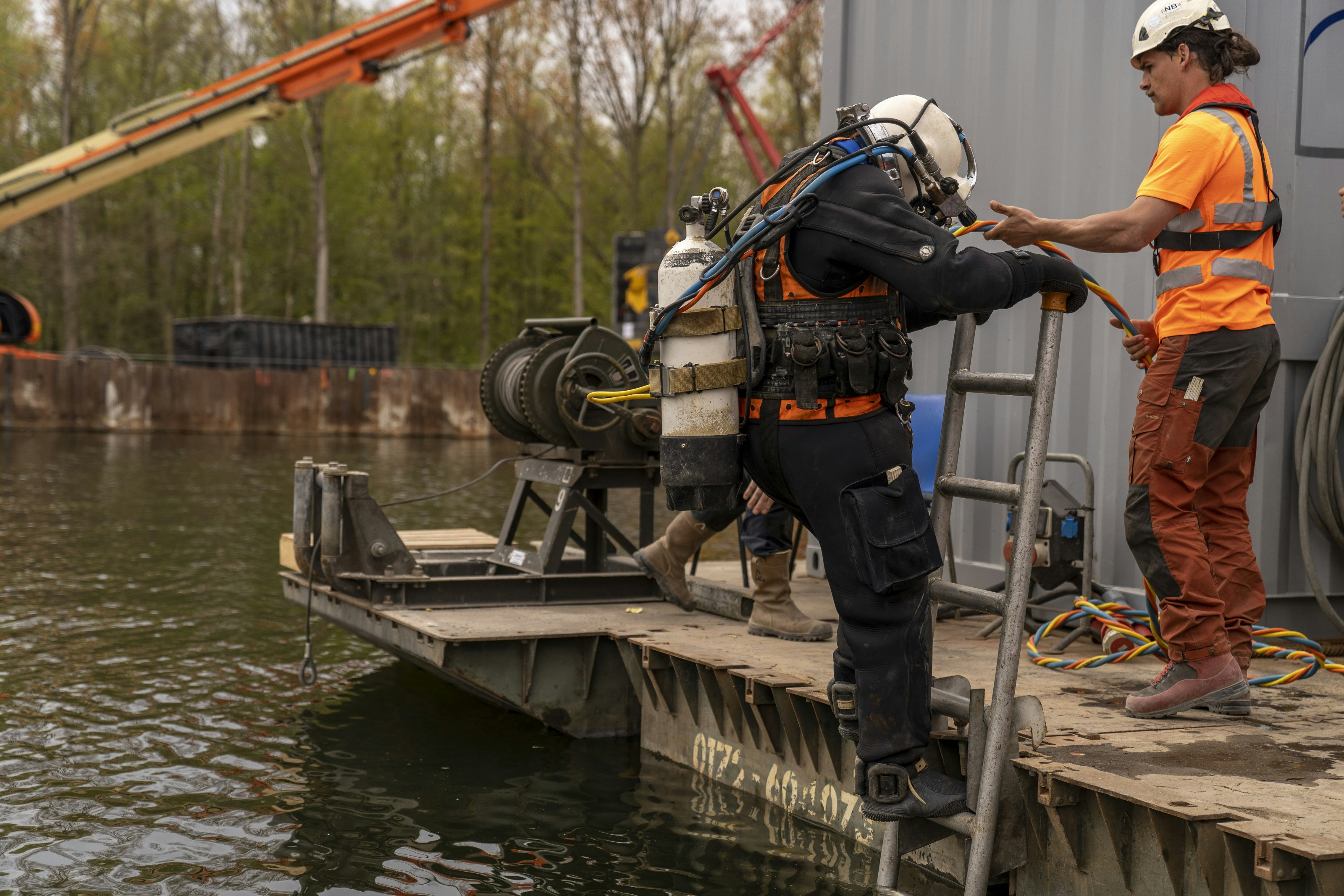 De bouw van de tunnel startte in 2020. In totaal bouwden we 7 km aan damwanden en gebruikten we 7700 funderingspalen. We stortten de vloer van gewapend onderwaterbeton, speciaal beton dat water nodig heeft om hard te worden. Hiervoor waren honderd duikers nodig. Vervolgens werd het beton voor de wanden en het dak in moten gestort.