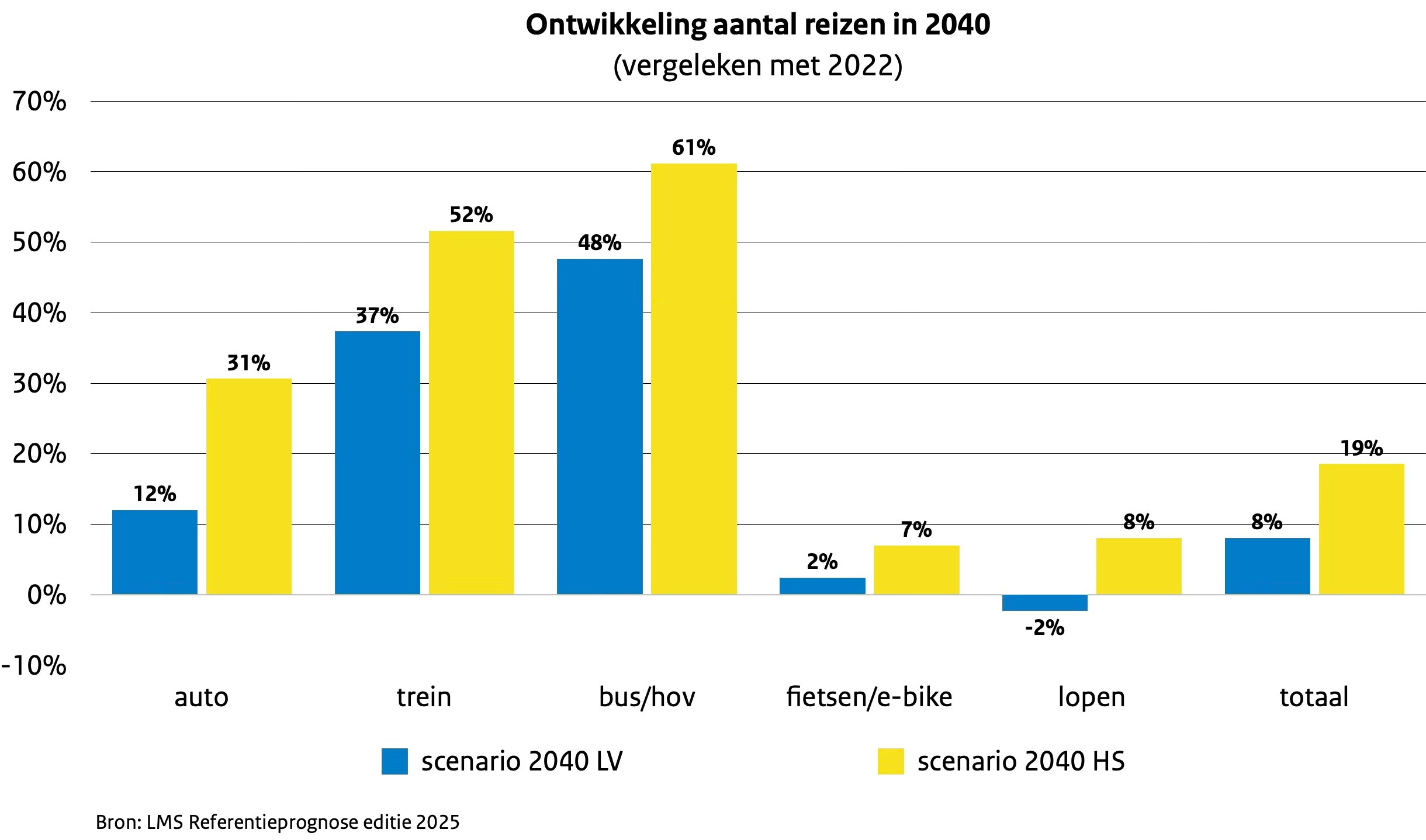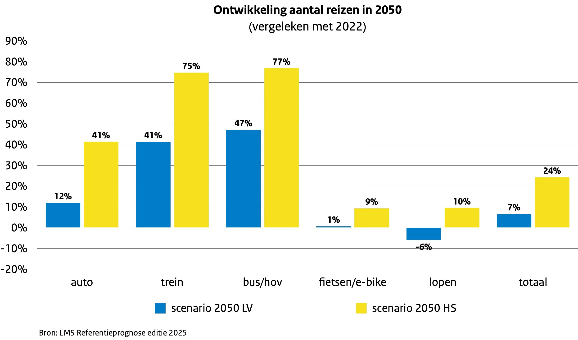 De algemene prognose voor het aantal reizen in 2050 is ook dat het totaal aantal gemaakte reizen met de auto, trein, bus, (elektrische) fiets en lopend gegroeid is vergeleken met 2022. Met uitzondering van lopen in het LV-scenario, deze daalt met 6%.