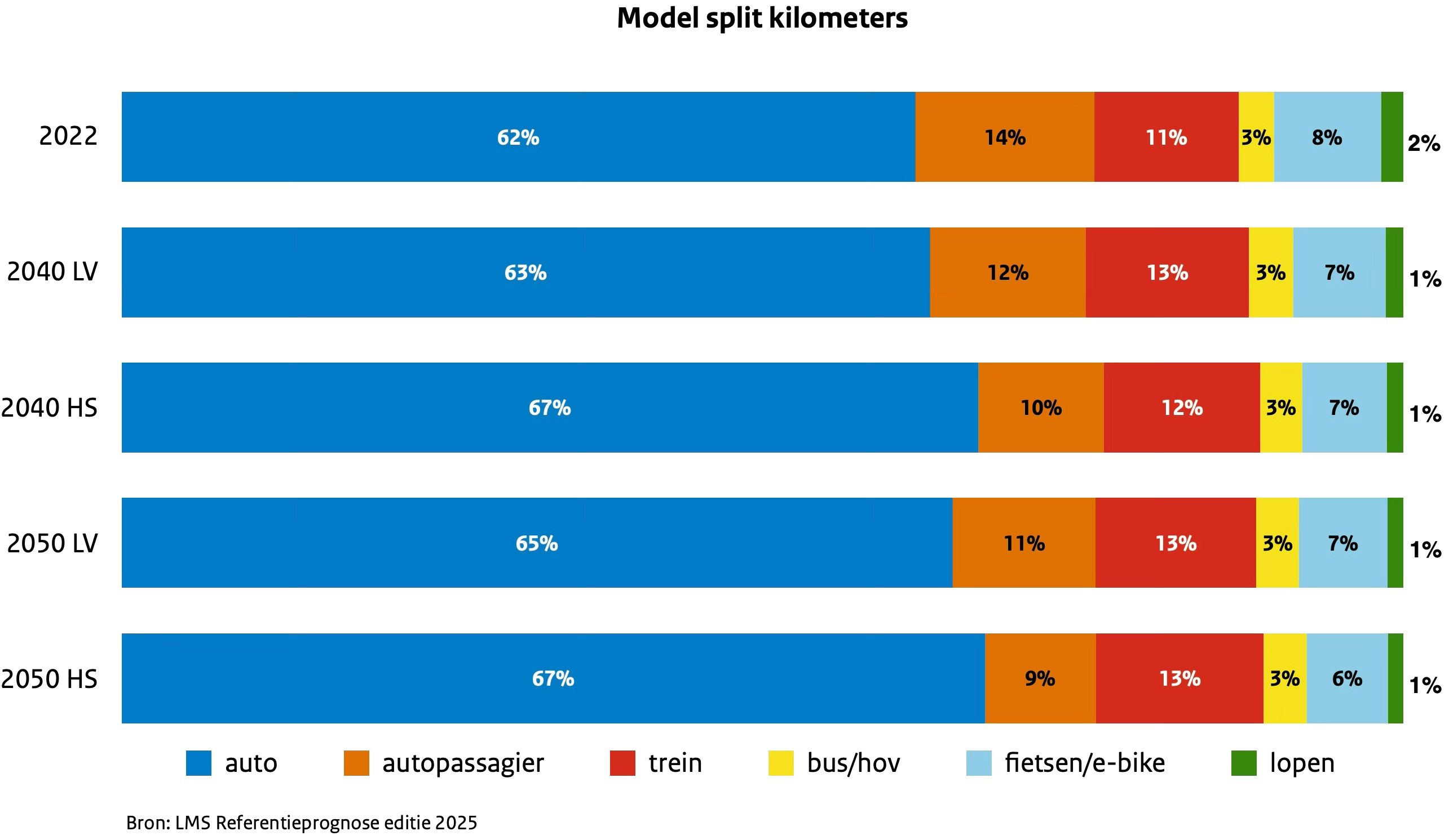 De afstand die een reiziger aflegt, drukken we uit in reizigerskilometers. De algemene prognose is dat het aantal reizigerskilometers in 2050 voor alle vervoerwijzen is gegroeid in vergelijking, vergeleken met 2022.