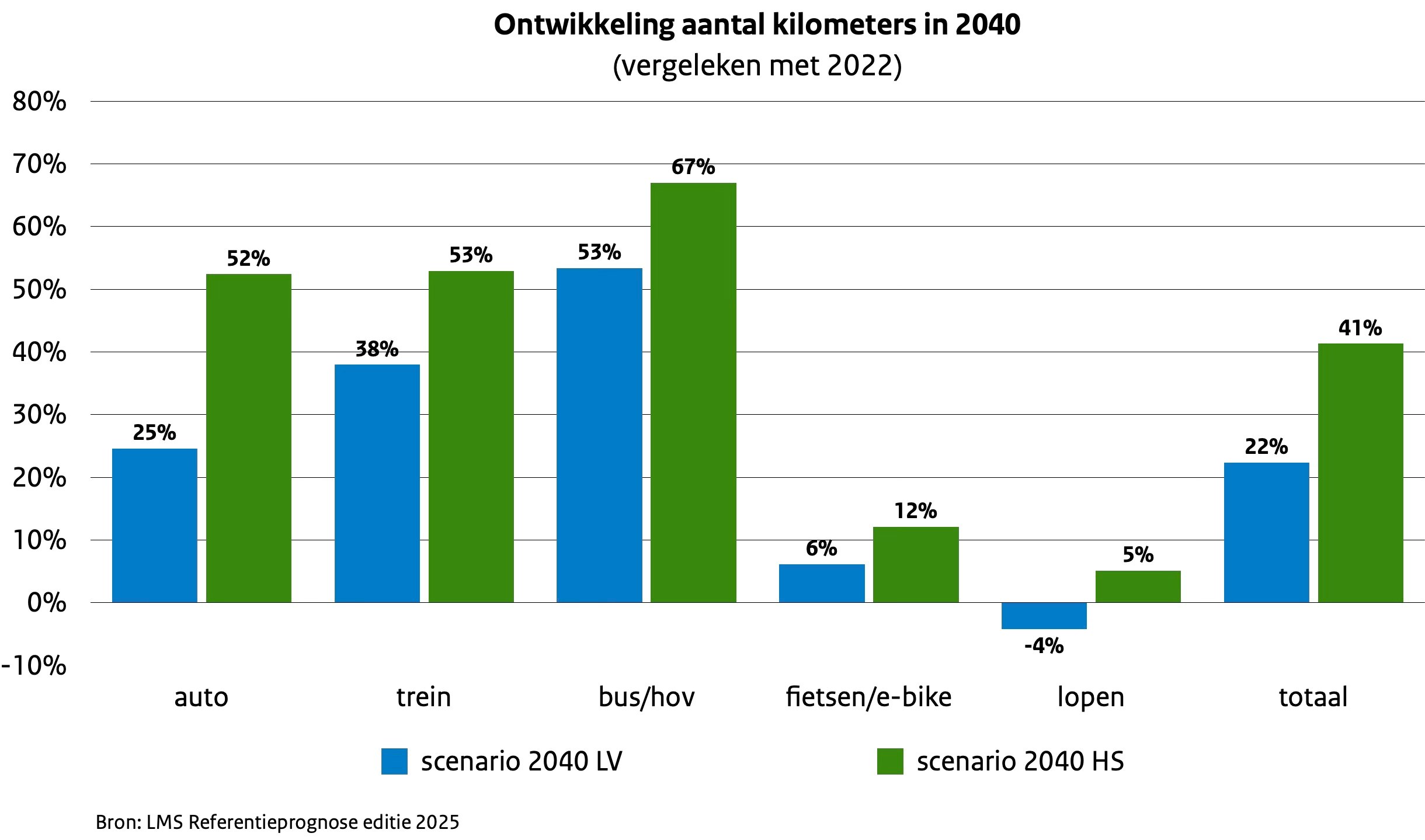 Alleen het aantal kilometers dat lopend wordt afgelegd, daalt licht in het LV-scenario. De groei van het aantal kilometers dat met de bus en HOV wordt afgelegd, is het sterkst.